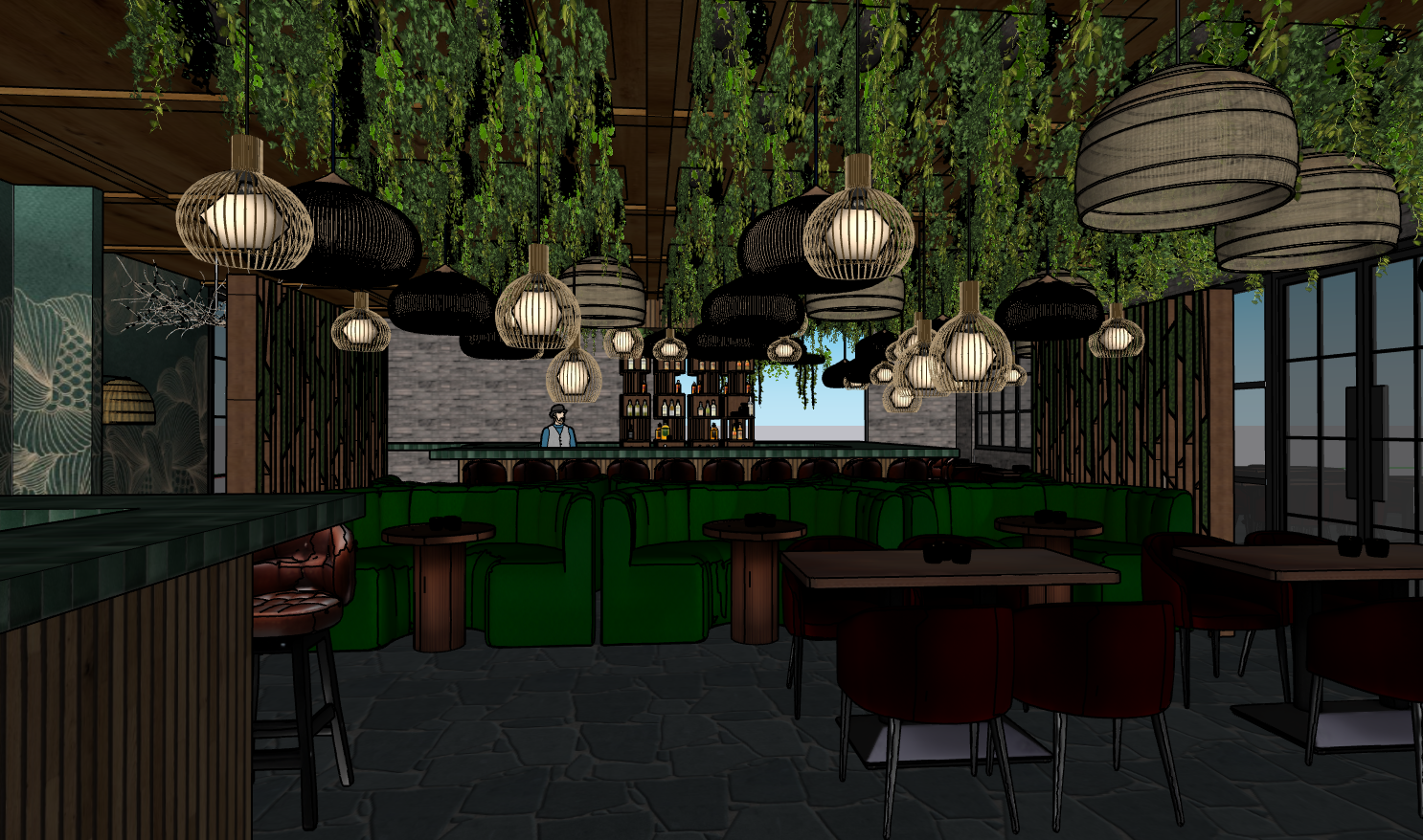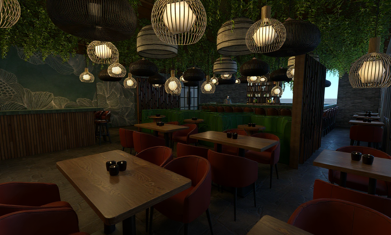 create a realistic interior rendering of the restaurant while maintaining the existing layout and furniture adjust the ceiling spotlight pendants to provide soft dim lighting that remains warm and clearly visible