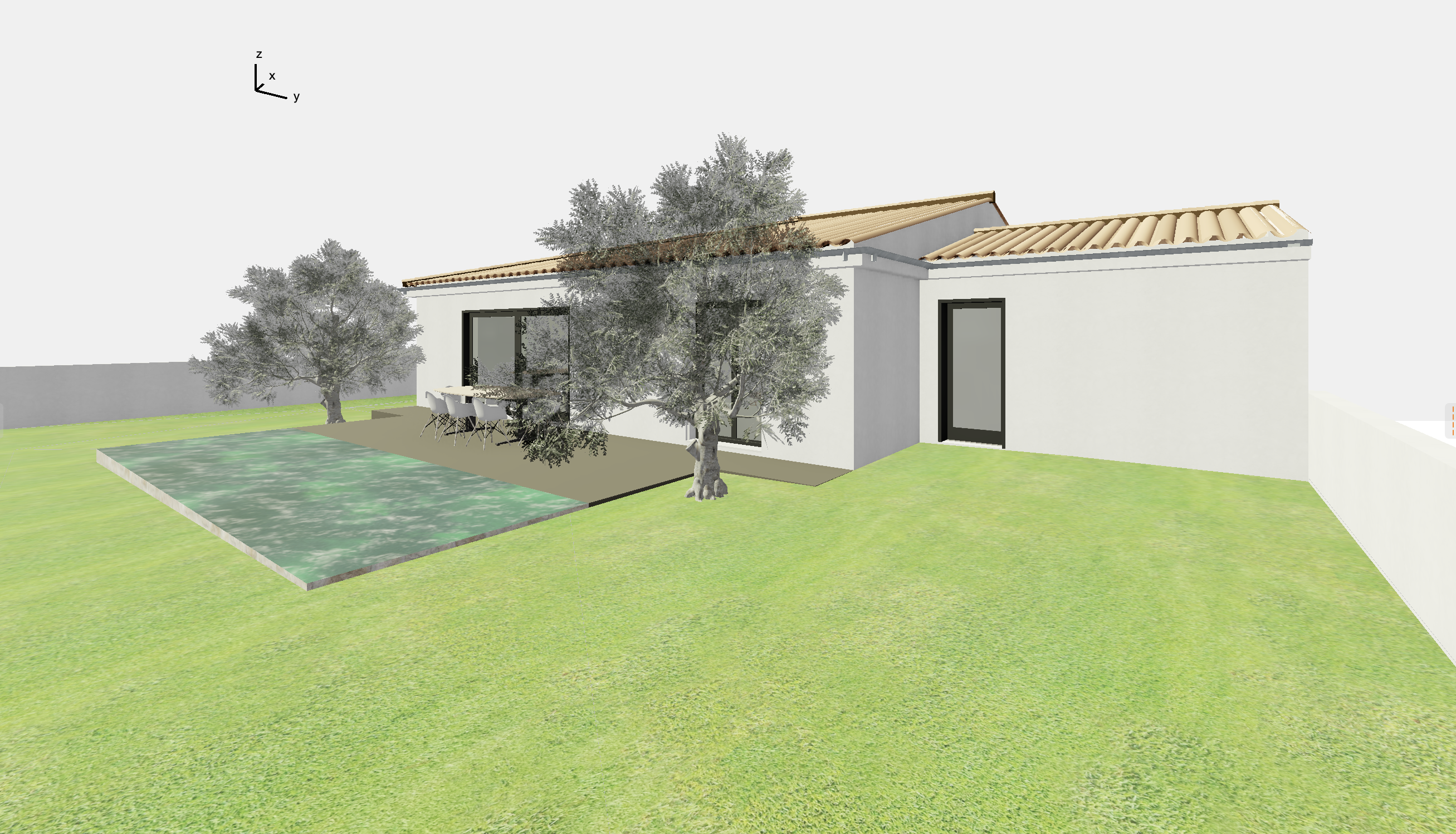 2 olive trees on each side of the terrasse and some mediterranean pine trees in the background add some palm trees and some lavender on the grass the plants are more organised there is a mix of lavender and other mediterranean plants