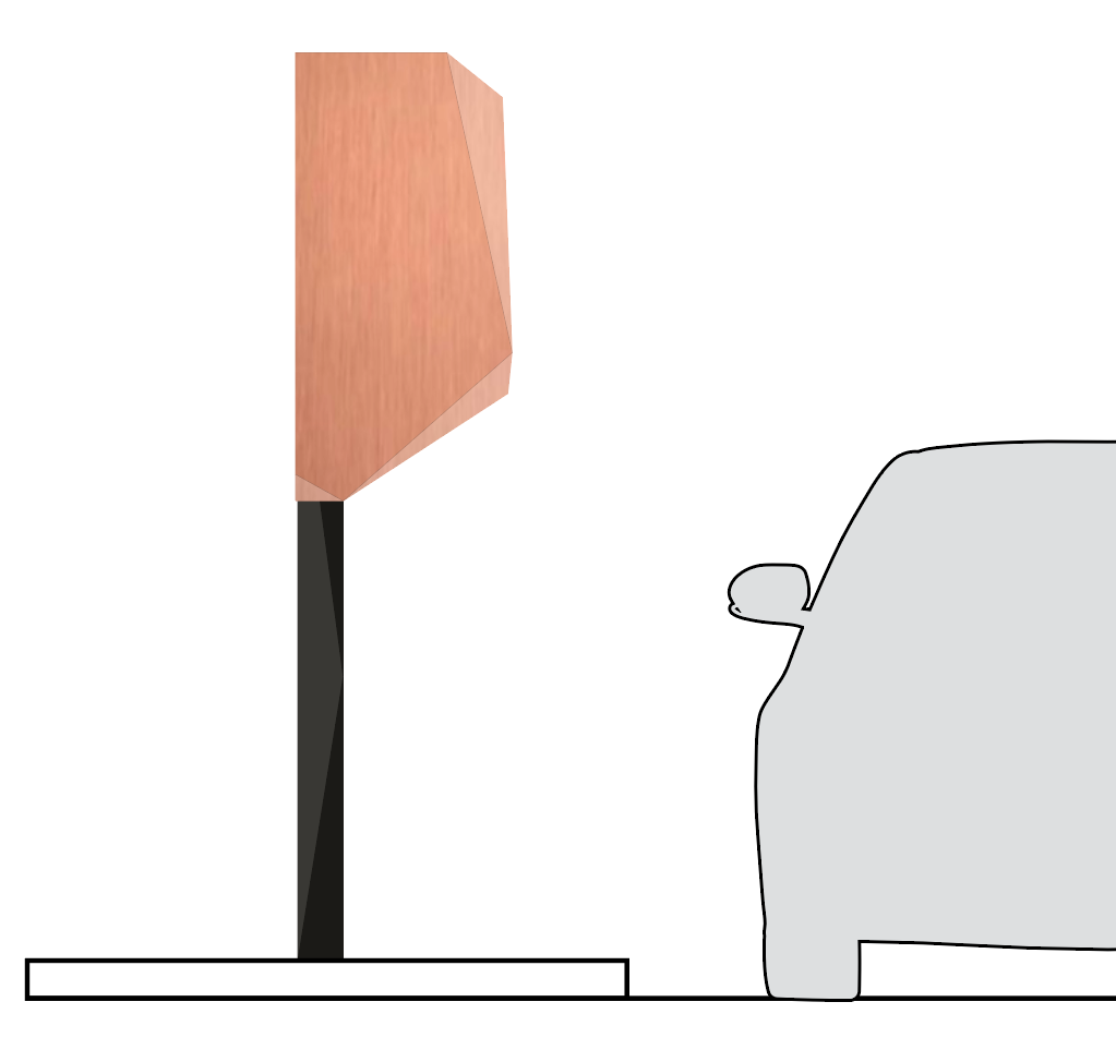 exterior shot convert the uploaded signage design graphic screenshot into a realistic 3d external pole signage render it in a dynamic perspective view positioned by the roadside leading toward a hotel lobby with a partial view of a car driving past beside the signage the signage panel material is aluminum with a hairline rose gold pvd finish featuring subtle bends and curves refer to the shading in the design to guide the bended shapes the supporting pole should be rendered in a black semi gloss painted finish for contrast the signage panel width is 540mm and the overall signage height is 1140mm surround the scene with trees shrubs and light landscaping to reflect a refined hotel driveway environment render with realistic daylight shadows metallic reflections and a soft sunny atmosphere to emphasize elegance and material depth
