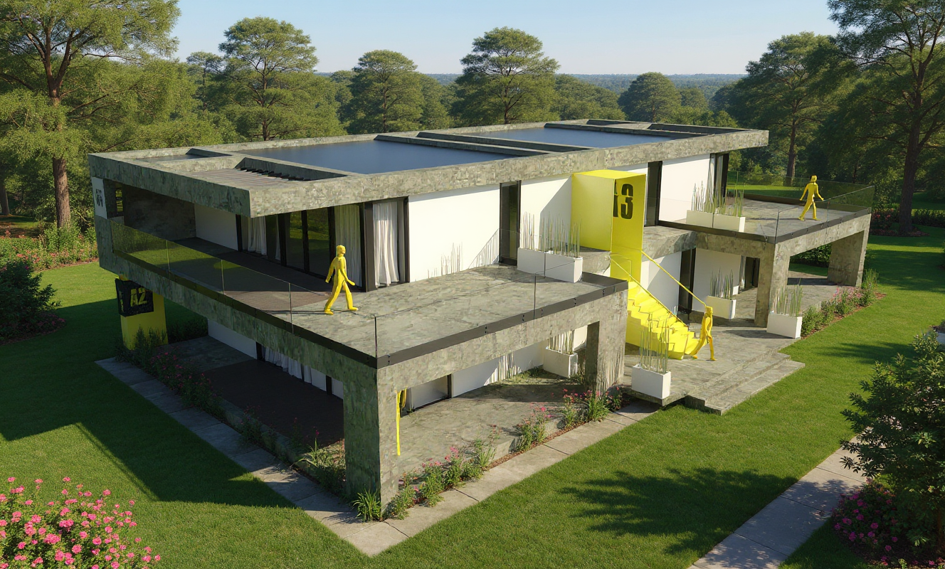 design a gable roof over the building roof covering with brick colored ceramic tiles