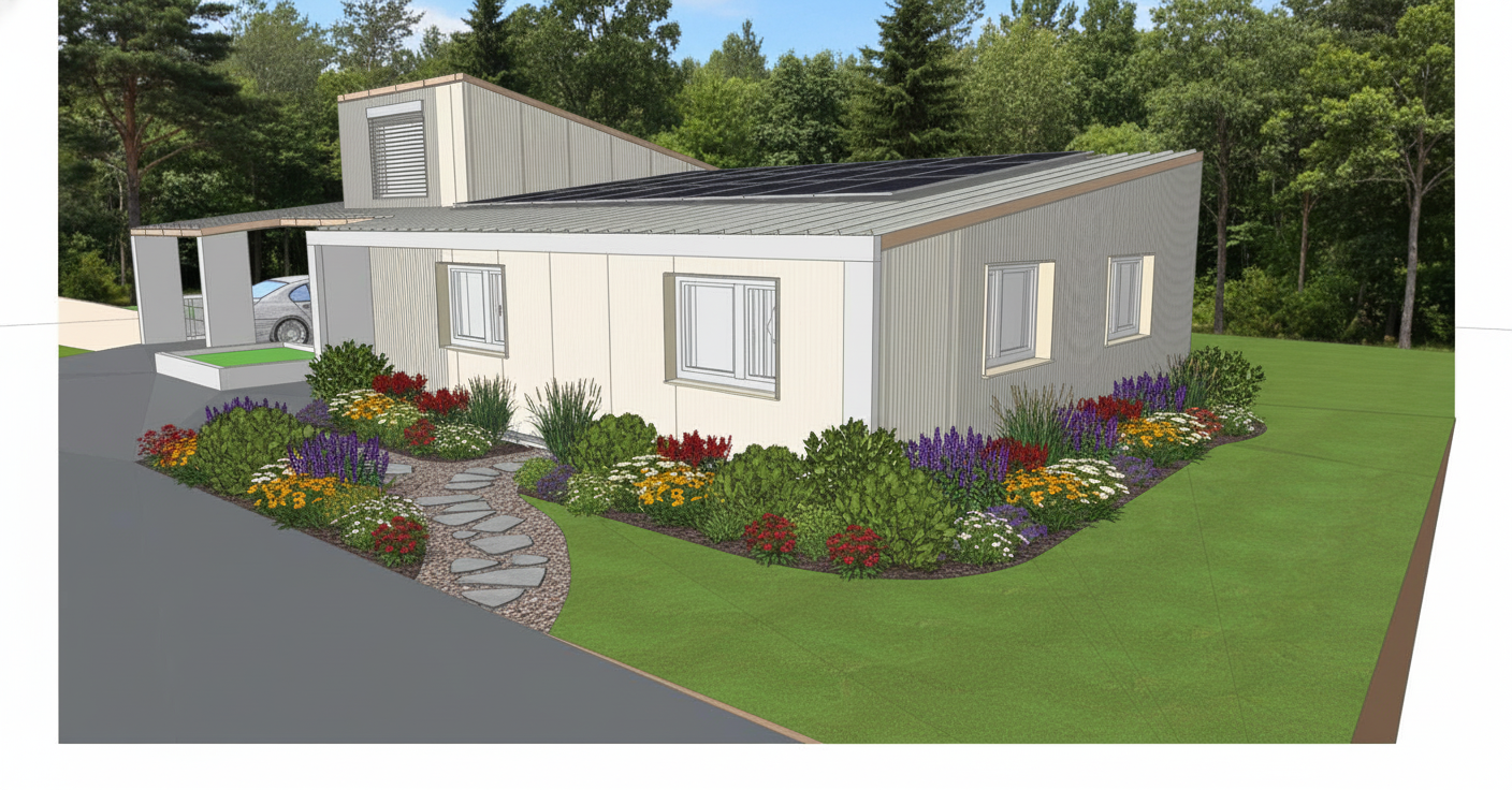prairie style exterior shot add some texture to the buildings some trees a banch stones on the floor and humain architecture