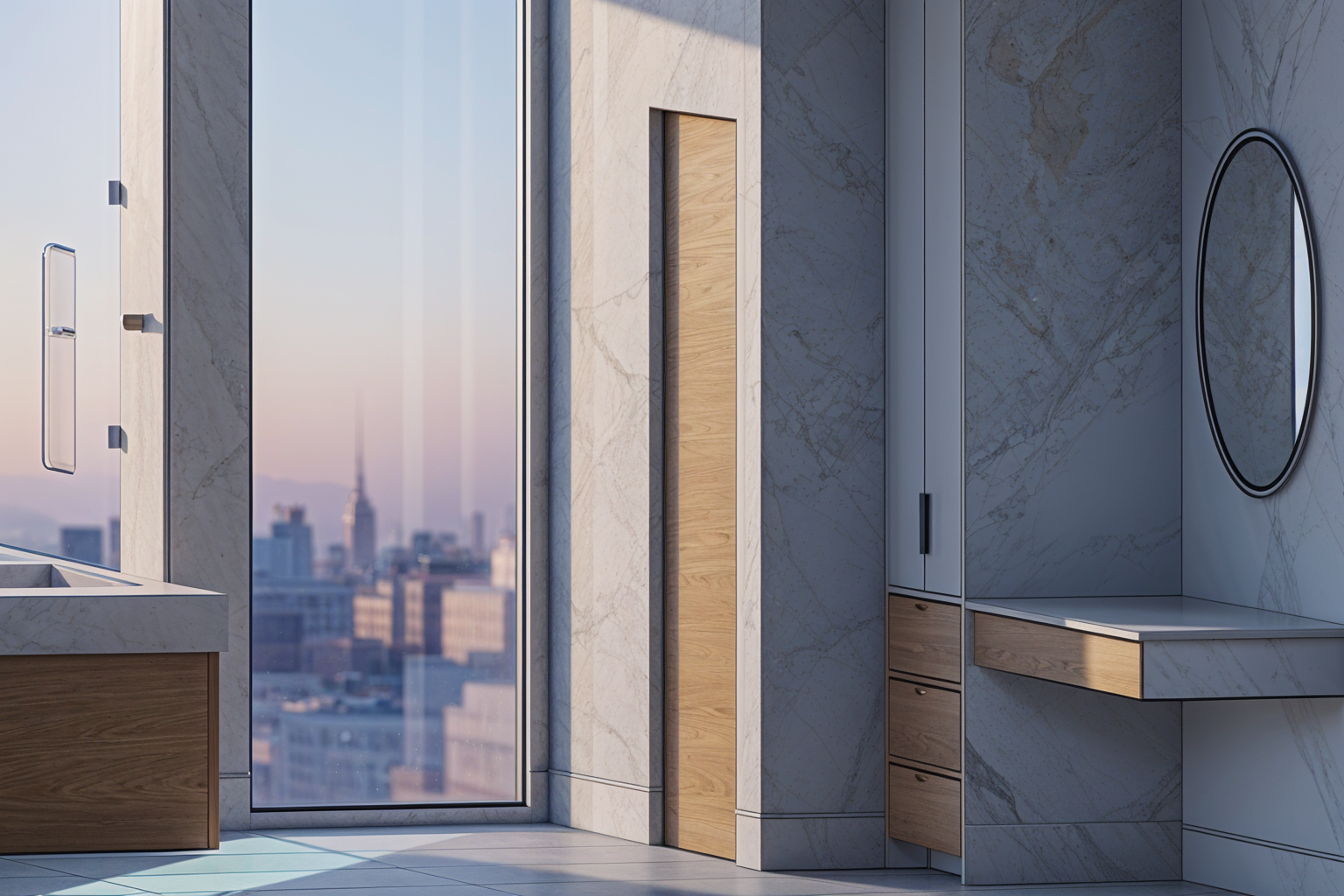 interior from the top create a modern interior scene with sleek minimalist design the cabinetry and wood panels should feature a warm light oak texture walls are smooth with a soft neutral gray tone include a large circular mirror with a black frame providing a contemporary touch the countertop is a polished white marble with subtle gray veining ensure ample natural light to create a bright and inviting atmosphere highlighting the textures and colors in the room