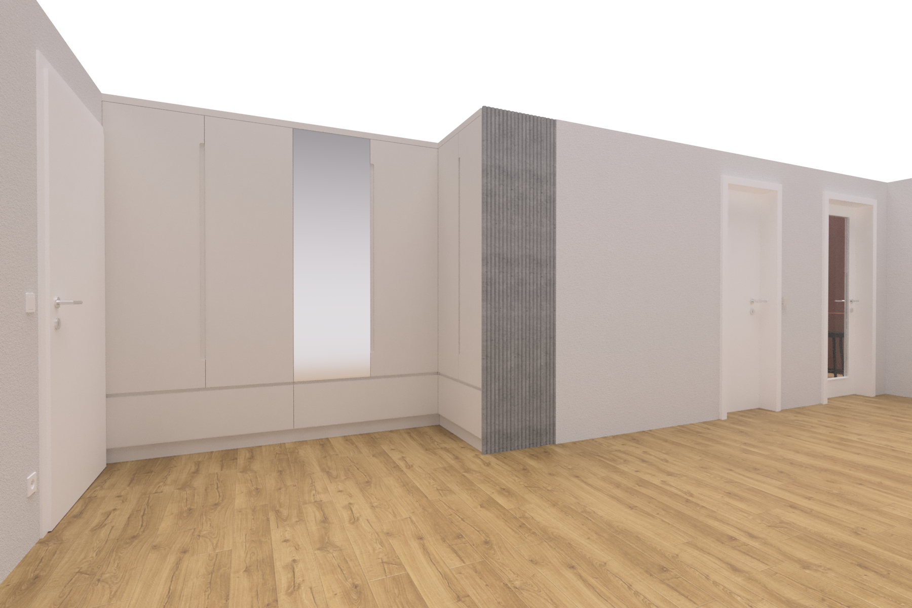 improve the realism of the provided interior render while strictly preserving the original composition and architectural intent strict rules must follow do not change camera framing proportions or geometry do not add remove or redesign any elements do not introduce any new light sources do not add led strips hidden lighting cove lighting or glowing ceilings the result must be based only on the provided image material and color specifications walls light white plaster subtle texture matte finish floor natural oak wood flooring warm tone realistic grain and subtle imperfections built in wardrobes light white chalk painted finish matte soft texture decorative wall panels grey concrete panels fine texture slightly rough realistic imperfections doors light white matte finish door handles brushed stainless steel realistic reflections subtle roughness light switch light white power socket light white lighting very important use only artificial lighting from ceiling downlights recessed spotlights light must clearly originate from downlights above no led strips no indirect ceiling glow no hidden lighting light should fall naturally onto walls doors wardrobes and floor create realistic light cones and soft falloff from downlights temperature neutral warm 3000 3500k add realistic shadows especially along the base of wardrobes in corners around door frames subtle ambient occlusion and contact shadows required rendering quality enhance global illumination and indirect bounce light add micro imperfections and realistic material response pbr improve depth and contrast while keeping a natural look keep the scene clean and minimal no stylization or extra elements goal achieve a highly realistic interior render with believable artificial lighting from downlights accurate material definition and natural shadow behavior while staying fully faithful to the original image