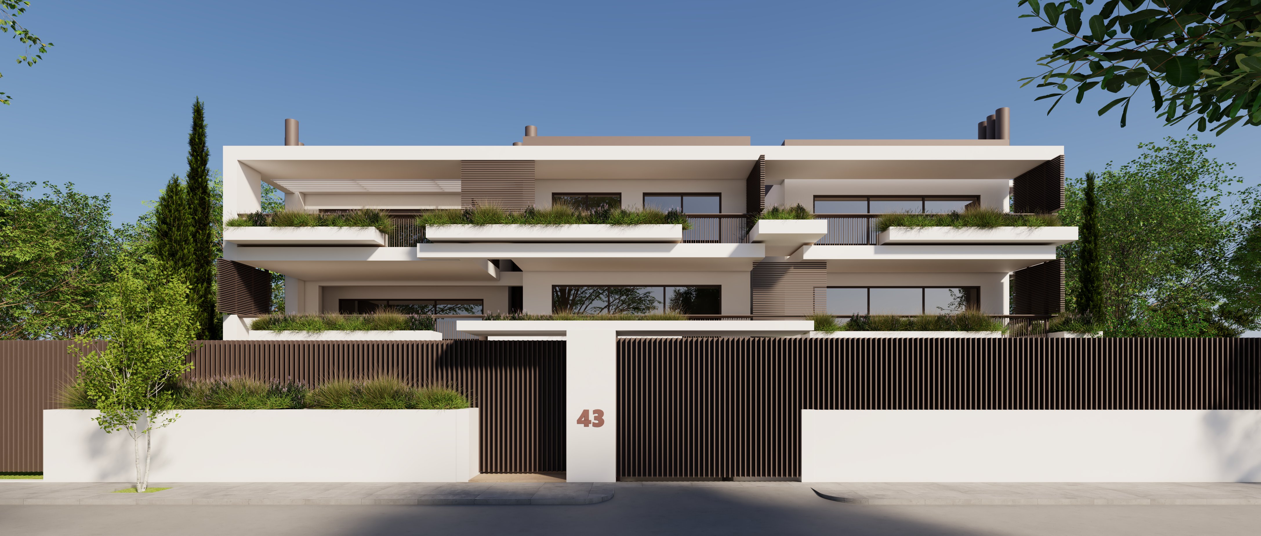 clean white walls dark brown metallic louvres