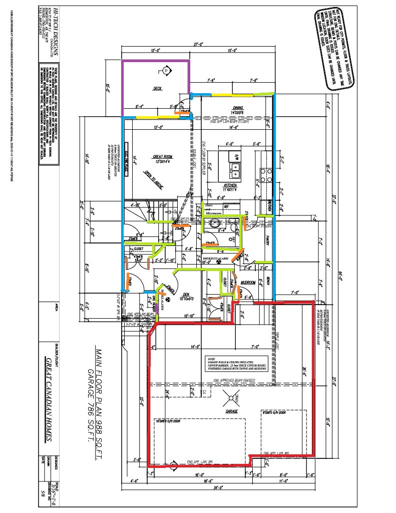 convert this floor plan into a realistic isometric 3d view of a full house show the space from an elevated angle with furniture walls and details visible this is extremely helpful your colour coded plan makes everything very clear let me compare the two images carefully what s still wrong in image 1 vs your marked plan 1 garage shape is wrong your red lines show the garage has an l shaped stepped footprint the left two stalls extend further back 26 6 and the right single stall is shorter 23 0 the render shows a plain rectangle 2 deck is not covered you ve confirmed it s a regular open deck not covered remove the roof cover over it 3 den location is wrong your green lines show the den is tucked between the garage and the main living area sharing the wall with the mudroom in the render it s floating separately 4 pantry is missing your green lines clearly show a dedicated pantry room on the right side between the kitchen and mudroom it s not visible in the render at all 5 mudroom shape is wrong your markings show it s a proper enclosed room with its own walls wider than shown 6 main entry is on the left side west wall based on your blue lines the render has it roughly right but the entry vestibule shape is off 7 windows placement your yellow lines show windows along the rear north wall of the great room and dining area that aren t reflected accurately here is your corrected full prompt to start fresh realistic 3d floor plan isometric aerial view of the main floor of a single family home total living area 988 sq ft do not add any covered roof over the deck the entire main floor living area is one flat level with zero interior steps or level changes use the following exact room layout exterior shape the main home living area is a roughly rectangular footprint 27 0 wide x 37 0 deep attached to the south front is a triple garage with an l shaped footprint the left portion 18 0 wide housing 2 stalls extends 26 6 deep and the right portion 11 0 wide housing 1 stall is only 23 0 deep creating a clearly visible step in the rear garage wall rooms from back north to front south open deck 12 0 x 10 0 open air no roof no cover attached to the rear north wall of the dining room accessible via sliding patio door from dining room wood decking with railing dining room 14 0 x 9 6 rear right of living area open to kitchen sliding door leads to deck large windows on north wall great room 12 0 x 14 4 rear left of living area open concept flowing into dining and kitchen open to above vaulted two storey height large windows on west and north walls kitchen 11 4 x 11 4 center right open to dining has a central island with sink appliance wall wall oven microwave refrigerator is on the wall shared with the 2 piece bathroom counters along east and north walls pantry enclosed room on the east side directly off the kitchen to the south has shelving accessed from kitchen only 2 piece bathroom center of the home south of the kitchen island contains toilet and sink only shares wall with kitchen appliance wall staircase central adjacent to the great room on the east side going up to the upper floor open railing coat closet small closet near the main entry on the west wall main entry west side of the home with a front door opens into the main living area near the great room den office 10 10 x 9 0 south portion of the living area between the main entry and the mudroom shares wall with garage has a window on the west wall mudroom south east of living area directly accessible from the garage interior has bench and closet walk through pantry connects mudroom to kitchen garage entry door interior door from garage into mudroom garage triple attached garage l shaped footprint 34 0 total width left section 18 0 wide x 26 6 deep houses 2 stalls one 18 x9 double overhead door on the front right section 11 0 wide x 23 0 deep houses 1 stall one 8 x9 single overhead door on the front stepped rear wall clearly visible concrete floor finished walls engineered raised beam across the garage opening show 3 cars parked inside finishes hardwood wood look flooring in great room dining kitchen hallways tile in bathroom and mudroom concrete in garage 9 foot ceilings throughout living area use the same furniture as shows on the plan do not change the orientation of the floorplan
