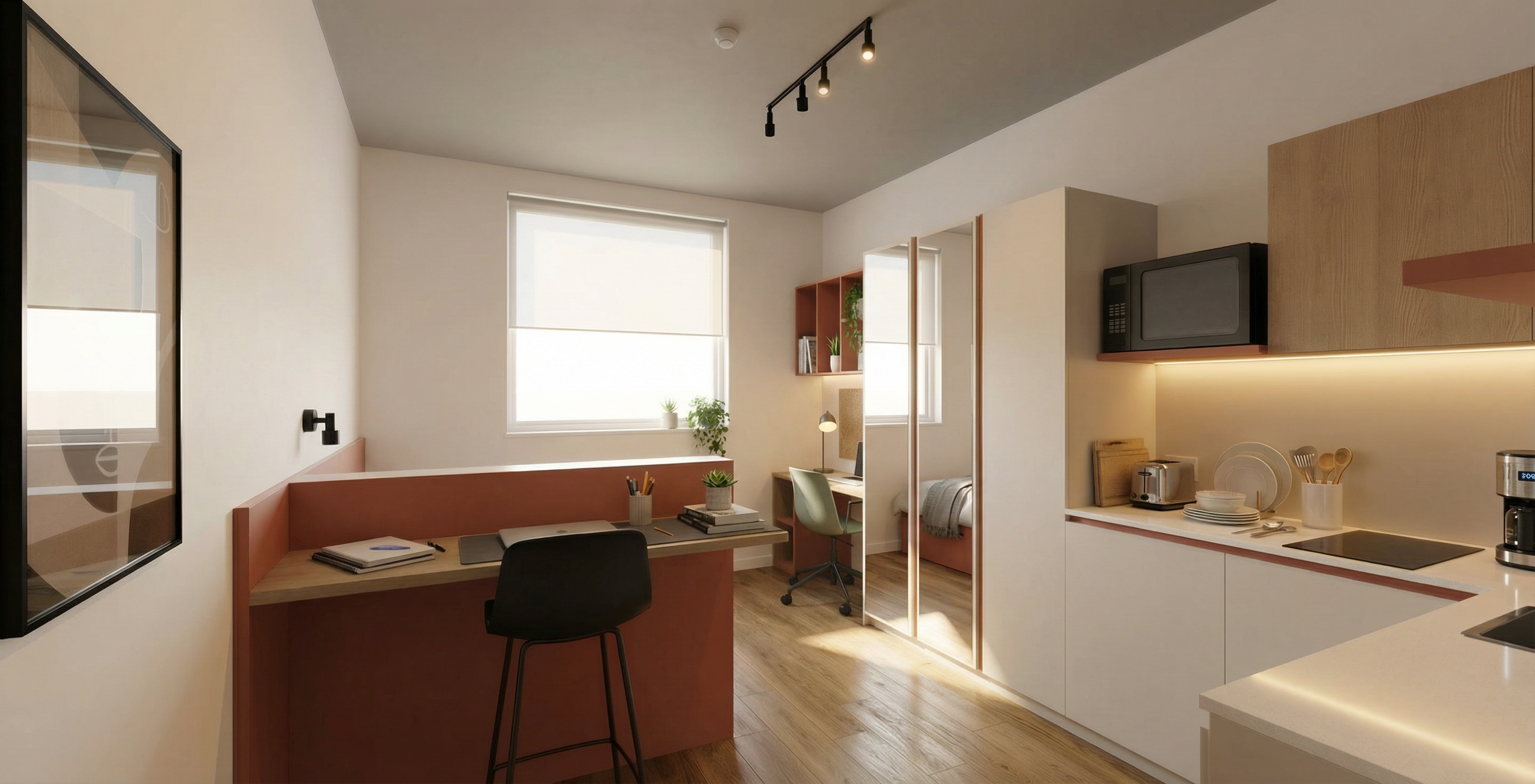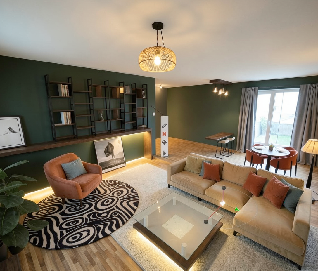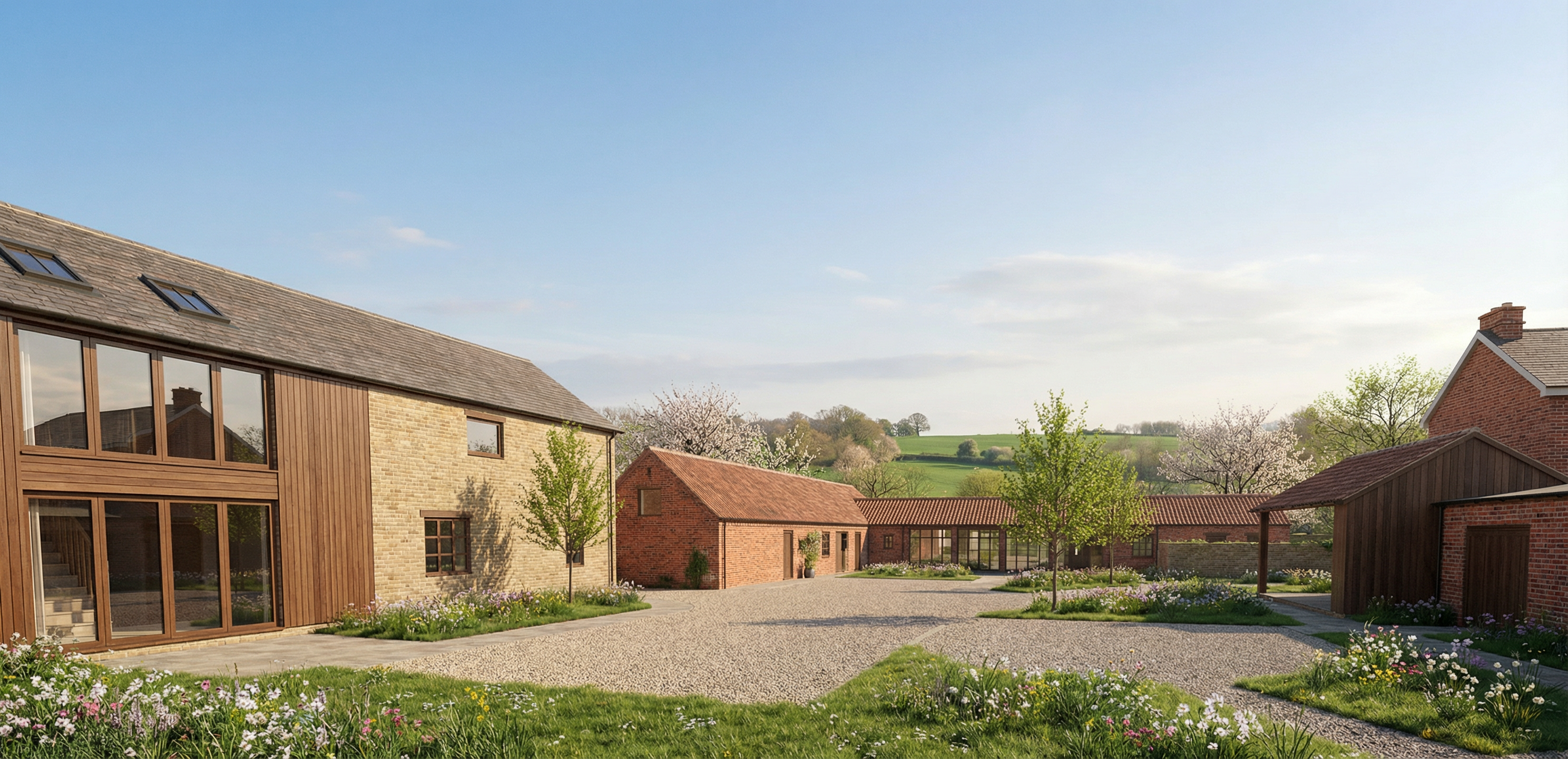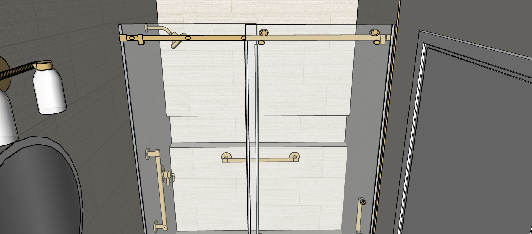 preserve all existing textures geometry materials colors and proportions overall scene is evenly brightened using neutral warm lighting only do not add highlights glow reflections or new light sources lighting comes only from the vanity light with white semi transparent scones warm and mirror with soft white semi transparent backlit halo warm evenly diffused there is no sunlight nor any light source other than the vanity light and backlit mirror the shower head and all shower fixtures are not light sources and emit no light all metal hardware and accessories are brushed brass the tile walls are unicolor heavy with 3d horizontal chiseled texture with a color code rgb 234 228 218 walls with no tile on them are painted in a rgb 234 228 218 color the light switches are white