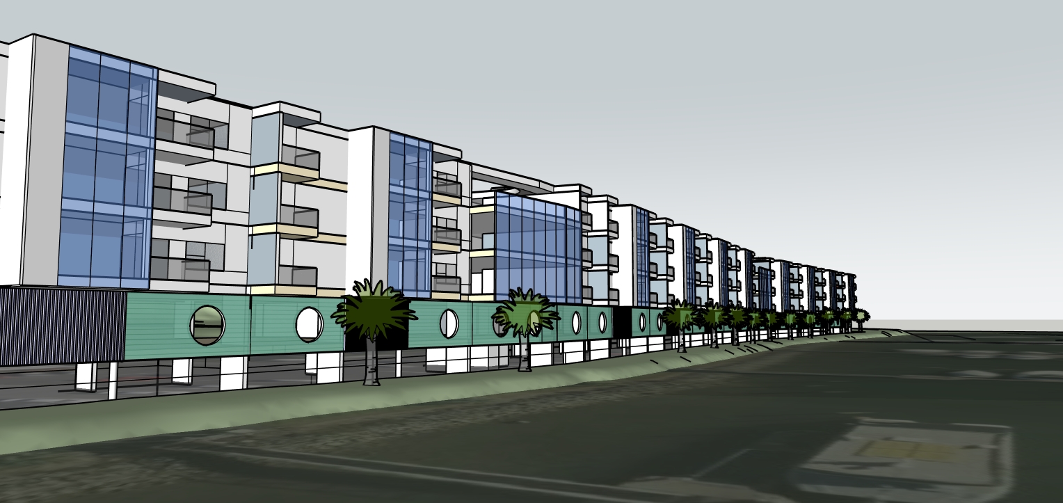 yachts in marina in the foreground people walking on boardwalks trees to look like phoenix palms