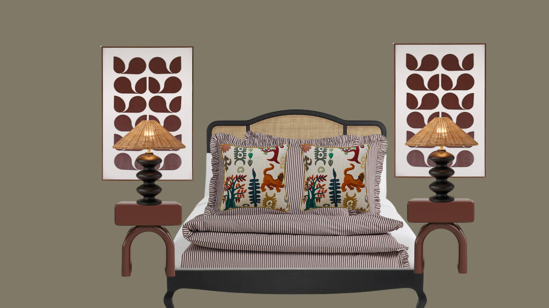 render this image into an architetural style elevation do not chnage the items within the bedding is the white and brown pinstripe with andrew martin scatter cushions