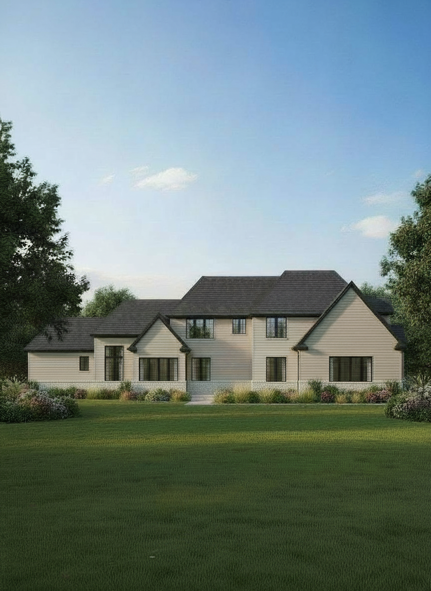 render elevation in vinyl siding of beige color down to grade eliminate all lower stone or brick windows to be black in color wrapped in beige trim and show dark charcoal dimensional roofing