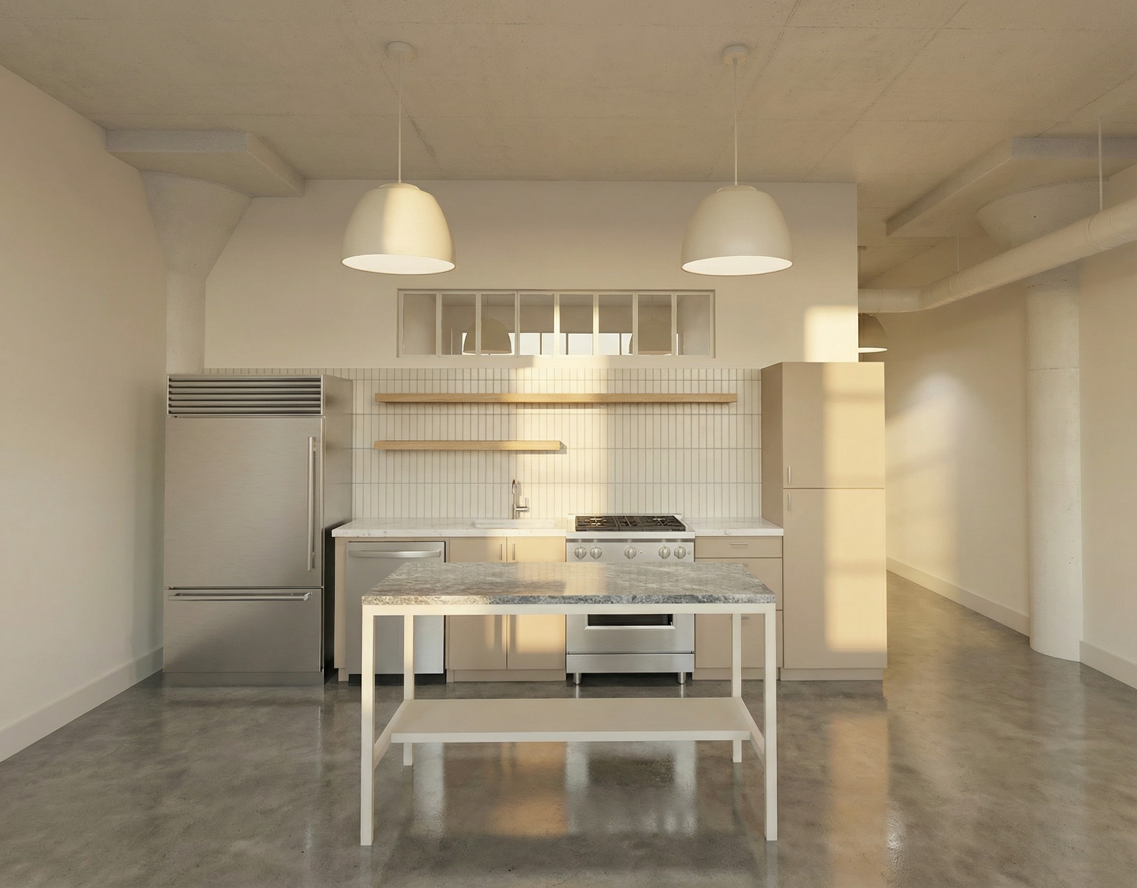 medium round bowl vase with white orchids and green moss on the island place three stacks of white ceramic dishware on the lower shelf of island do not change anything else do not change view do not add any other furniture do not add artwork