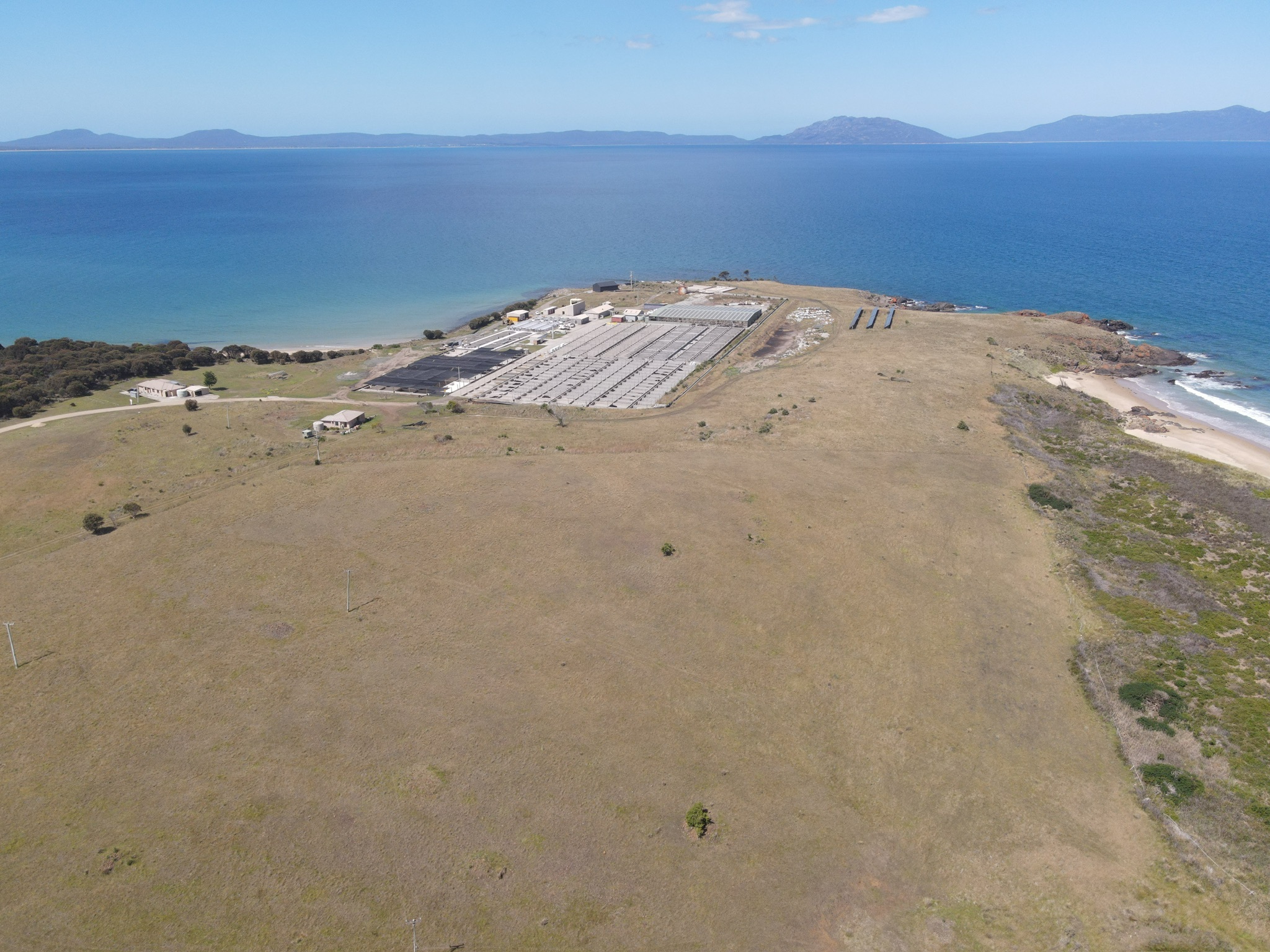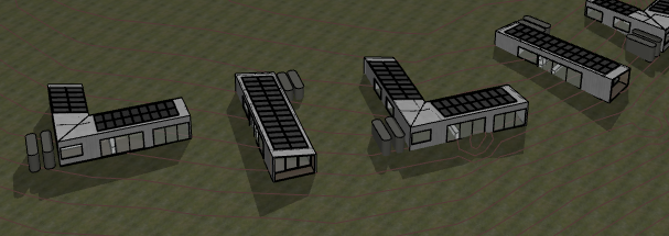 exterior shot single storey architectural eco cabins with solar panels and rain water tanks on a field of green grass
