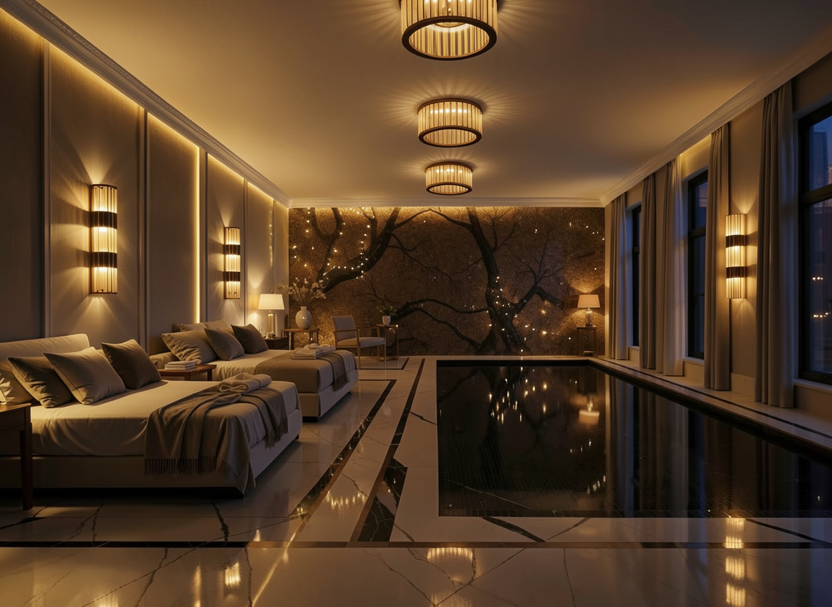 transform this visualization into an evening lighting scenario with intensified atmosphere keep all materials textures and architectural elements exactly as designed emphasize layered artificial lighting ambient ceiling glow accent lights highlighting key architectural details and subtle decorative lights to enhance textures of walnut mineral surfaces and velvet increase shadow play contrasts and reflections to make the space visually rich and immersive the mood should feel luxurious intimate and cinematic highlighting the concept of layered illumination without altering materials colors or geometry
