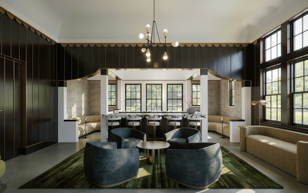 render a hyper realistic modern high end contemporary three story house in florida setting where there are palm trees and the lights are lit up on the outside of the house the window frames are dark gray maintain the window design where there are shutter design on left and right side in walnut wood the garage door is a sleek modern design in matte walnut wood with wide horizontal panels and narrow glass inserts that create a clean contemporary look while letting in controlled natural light the roof is gray metal roof featuring a mix of gray brick white stone featuring large windows the exterior features an accent of bricks exterior wall clad in dark gray linear stone veneer the stones are long narrow and horizontally stacked with tight joints creating a sleek contemporary texture subtle variation in gray and dark gray tones adds depth without looking rustic the surface is matte with crisp edges and a refined architectural finish located on the left center where the 3 windows are located and it wraps around on the left atleast 1 foot the finishing around the garage doors are light bricks that are stacked linear gray stone veneer with a mix of cool toned shades tight horizontal joints and a clean contemporary texture modern residential entrance featuring a rectangular arch clad in smooth light gray colored panels with crisp vertical lines same as the garage door the main door is 6 feet wide made iron it has full glass lite frosted glass no mulls the trellis are all in walnut color the walls are a soft light gray with a smooth finish creating a serene and inviting atmosphere with lots of greeneries and landscape and with dramatic sky