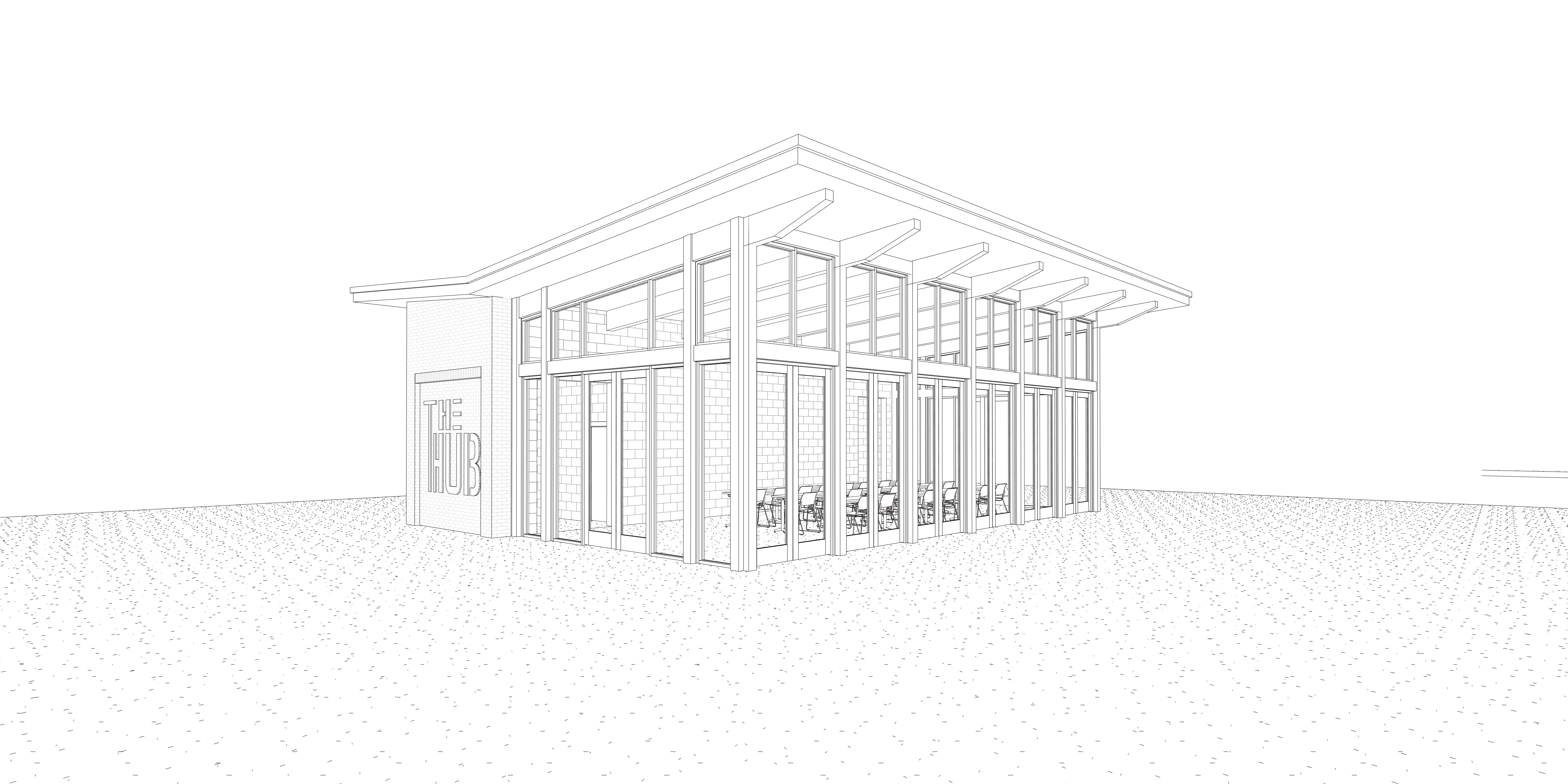 render a photo realistic picture of this 1 200 square foot pavilion located in selma alabama situated near a riverfront setting with a contextual relationship to the historic surroundings the architectural concept should blend vintage historic character with modern industrial design the front fa ade and approximately one third of one side of the building features traditional red or warm toned brick expressing a classic historic southern aesthetic this portion includes the main public facing elements aluminum storefront systems with glass entry doors and a concessions service window integrated into the brick fa ade on the brick portion of the side elevation the one third brick side there are exterior storage lockers on the right side and bench directly adjacent both are recessed into the brick fa ade and integrated into the architecture the remaining two thirds of the building rear and side elevations should transition into a vintage modern industrial expression these elevations should consist primarily of full height glass storefront systems framed in black metal creating transparency and strong indoor outdoor connectivity toward the river incorporate black metal wrapped structural columns along these glazed fa ades to emphasize rhythm and vertical articulation above the glass storefront systems include warm wood paneled transoms to soften the industrial character and introduce natural material contrast the roof is a metal butterfly roof with matching black metal soffits reinforcing the modern industrial aesthetic while maintaining durability interior the space should be minimally furnished with only simple tables and chairs emphasizing openness and simplicity material palette primary brick glass black metal secondary warm natural wood accents burnished cmu interior design intent the pavilion should feel inviting open and civic oriented with a strong visual connection to the riverfront and surrounding landscape lighting soft natural daylight with warm interior glow in evening renderings the front fa ade and approximately one third of one side of the building features traditional red or warm toned brick expressing a classic historic southern aesthetic the remaining two thirds of the building rear and side elevations should transition into a vintage modern industrial expression these elevations should consist primarily of full height glass storefront systems framed in black metal creating transparency and strong indoor outdoor connectivity toward the river incorporate black metal wrapped structural columns along these glazed fa ades to emphasize rhythm and vertical articulation the roof is a metal butterfly roof with matching black metal soffits reinforcing the modern industrial aesthetic while maintaining durability lighting soft natural daylight with warm interior glow in evening renderings