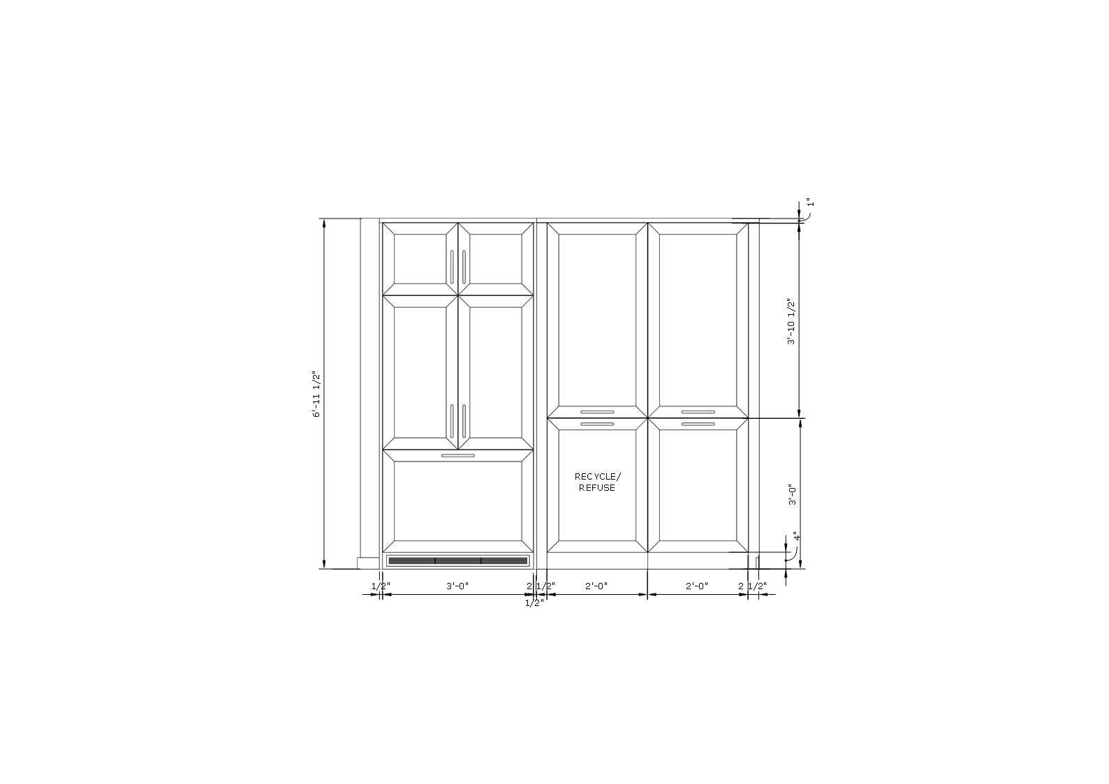 craftsman style cabinet on the right are solid cabinet on the left is a fridge