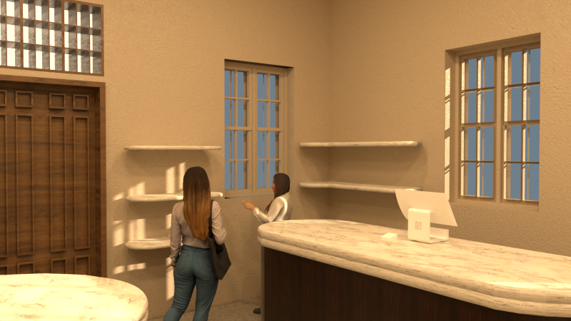 enhance clarity realism sharpness and lighting keep all meterials colours layout faces on people and objects exactly the same only add bottles with dark liquid and purple label to the shelves