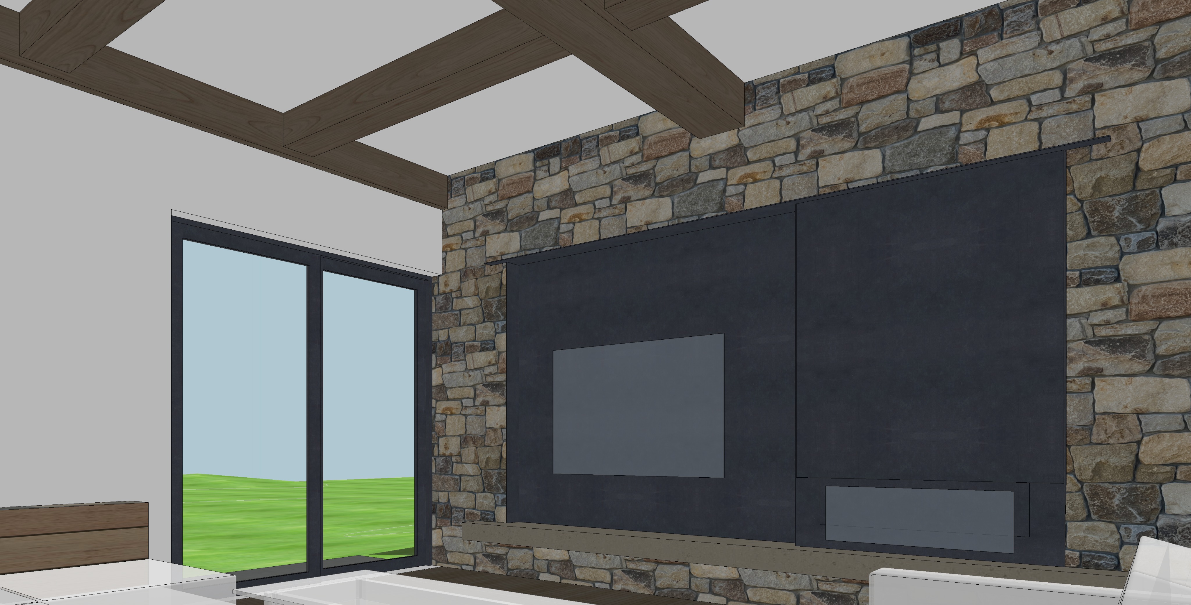 sheetrock walls sheetrock ceilings fabric couch sheetrock colored drapery hanging from perimeter beam on left side of window