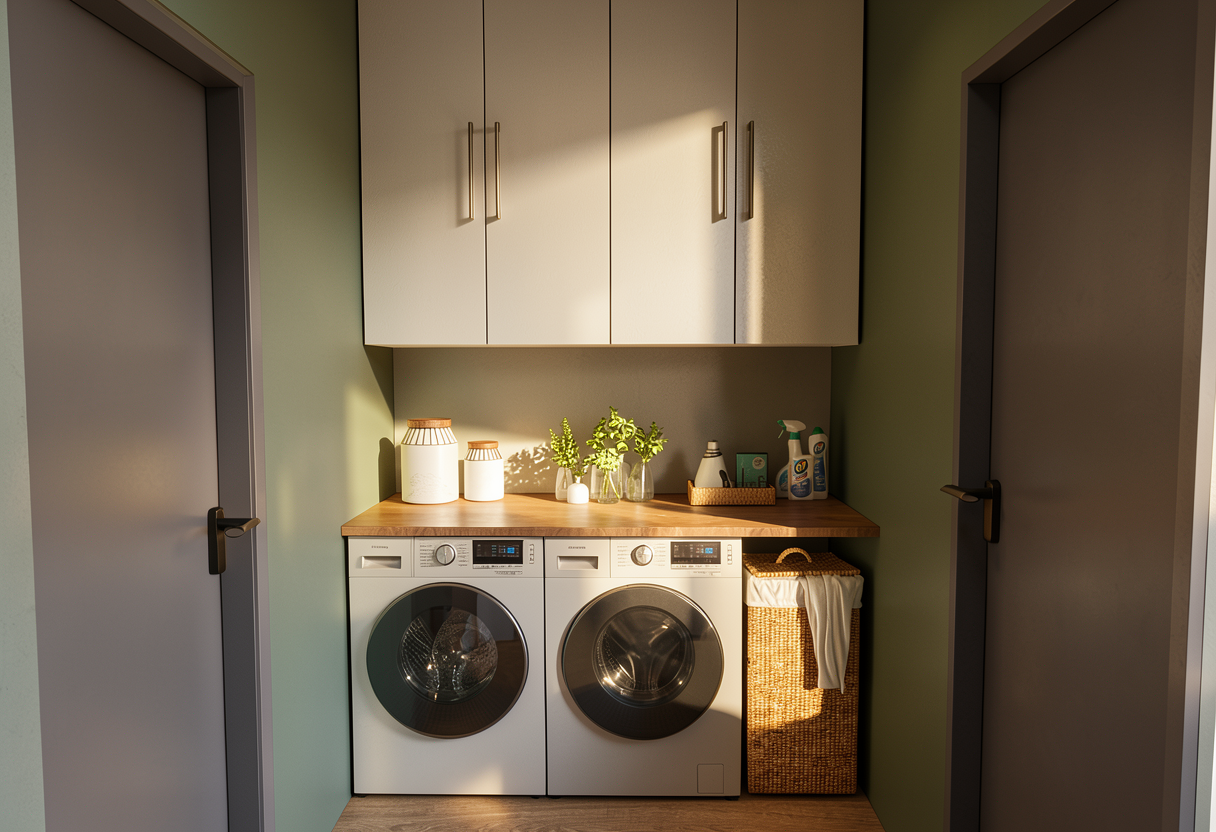 luxurious bathroom shiny dark emerald tiles in shower and right hand side wall with creamy cobblestone towards the white for the walls behind vanity lights coming out from the light fixtures sconces on the walls all the hardware plumbing around mirror and bases of sconces are polished nickel very light white marbley floors and counters white ceiling a recessed spotlight in the linen closet shining through the glass shelves where the towels are white ceiling clear shower door the cabinets are soft sage