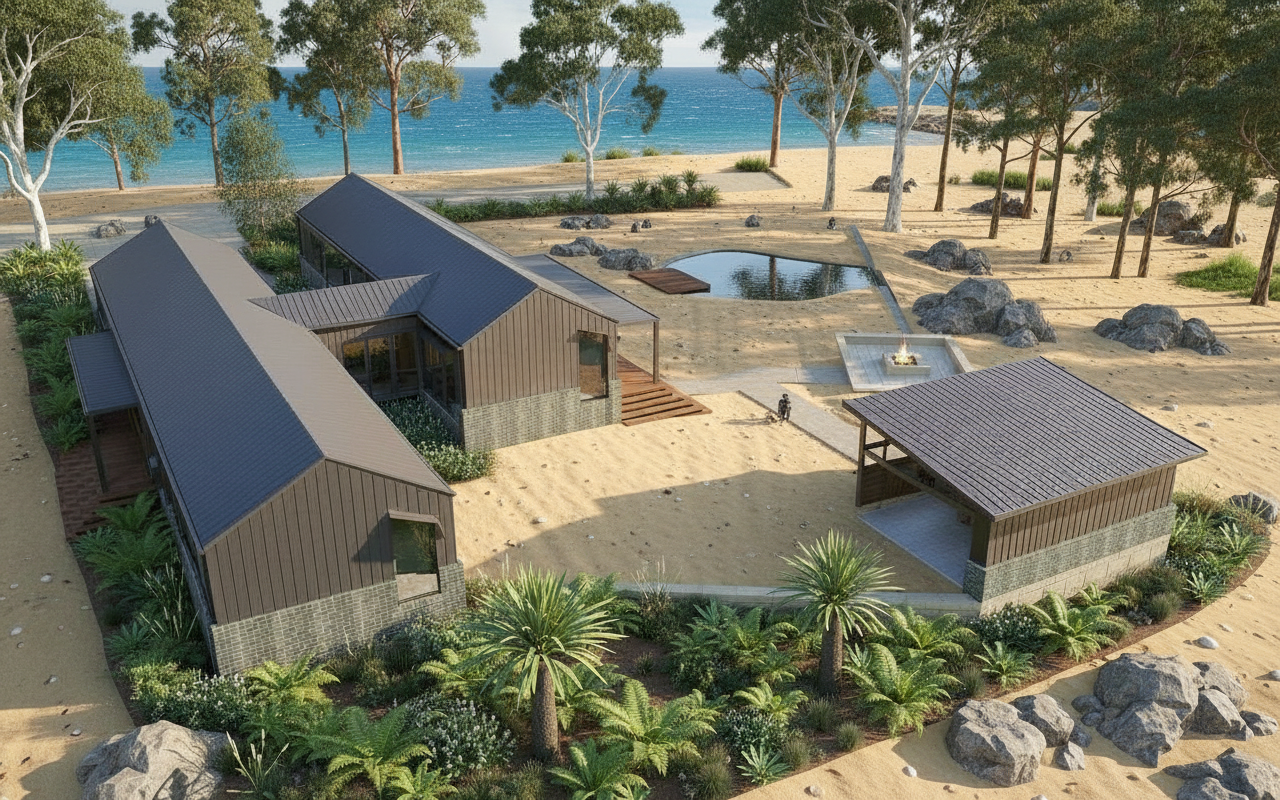 place small sandy beach and natural rocks in existing pond