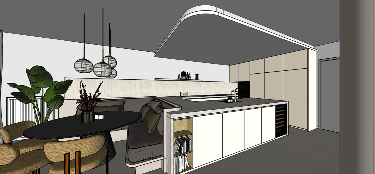 use the uploaded sketchup screenshot as the exact spatial reference for the scene create a highly photorealistic architectural interior render of this living space with kitchen maintain the original layout proportions camera angle and all furniture positions from the screenshot the colors and materials visible in the image must be respected but reinterpret them as realistic materials with natural textures reflections and lighting real wood grain realistic stone or composite countertop matte painted walls natural fabrics etc improve realism through accurate global illumination soft daylight entering from the windows subtle shadows and physically correct materials the space should feel warm contemporary and lived in but without changing the design add subtle interior styling elements that fit the architecture a few plants minimal decoration realistic kitchen objects while keeping the scene clean and believable optionally include a calm brown labrador lying or sitting naturally in the living area to add life to the scene ultra realistic architectural visualization natural lighting high dynamic range realistic lens 35mm interior photography style high detail professional architectural render