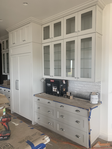 adjust for natural lighting remove everything on the floor add new flooring stage the countertop stage the items on the glass shelves in the cabinets