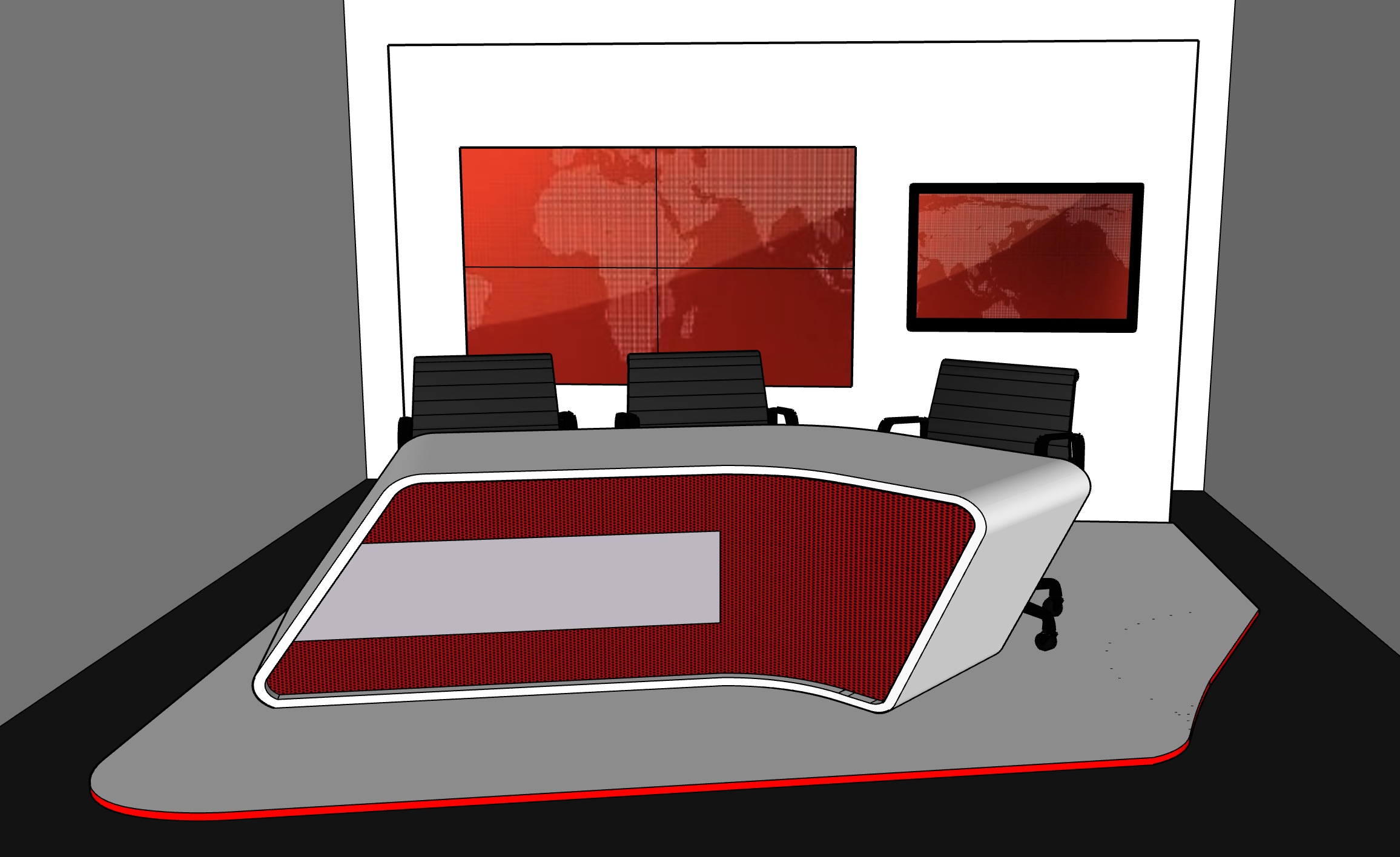 es un plat de televisi n las paredes laterales son blancas y el suelo el pvc blanco la raya roja delantera es un led rojo y los cuadrados traseros son pantallas led y un tv