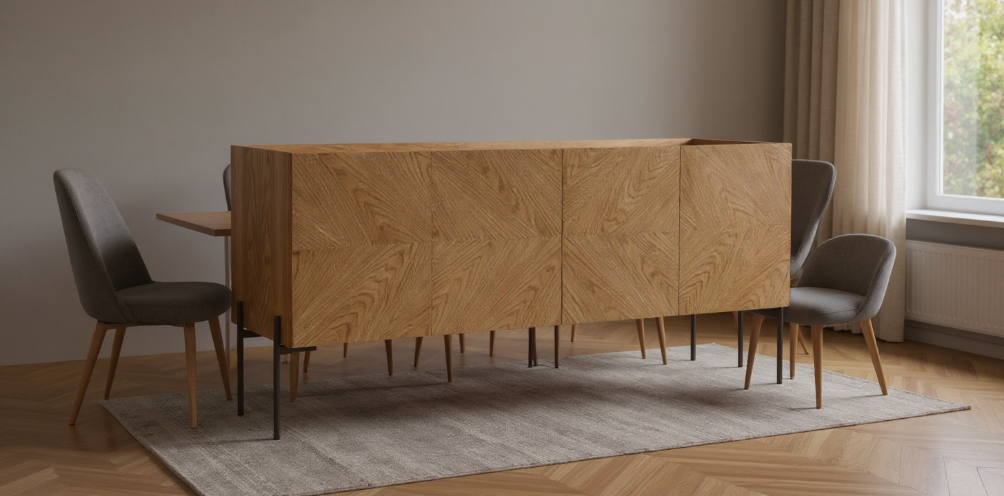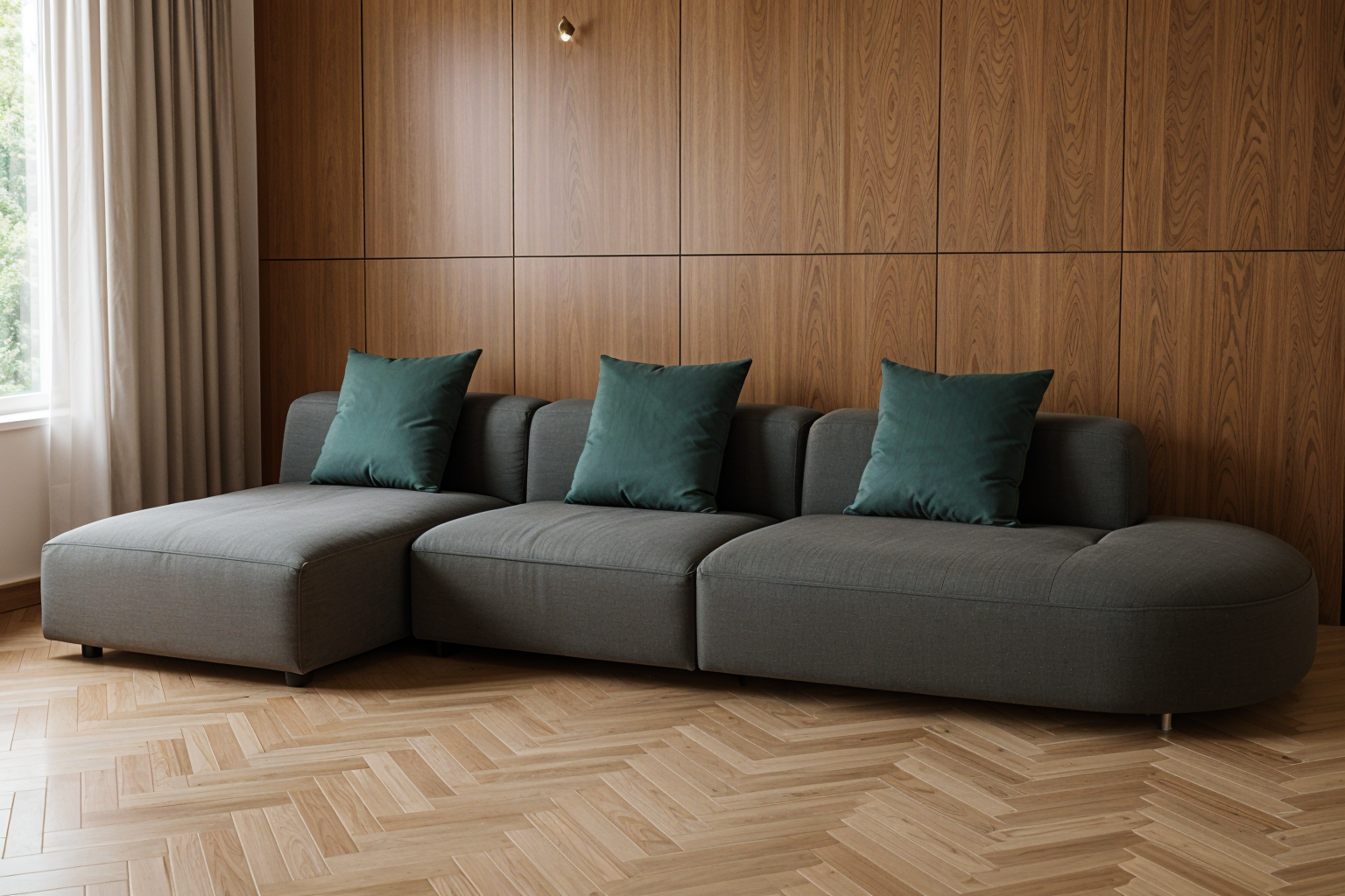 modern living room the sofa is against the wall wood stripped panel neutral textured rug under the sofa and high quality black metal and marble coffe table modern hanging lights hanging from the cieling and some green leafy plant