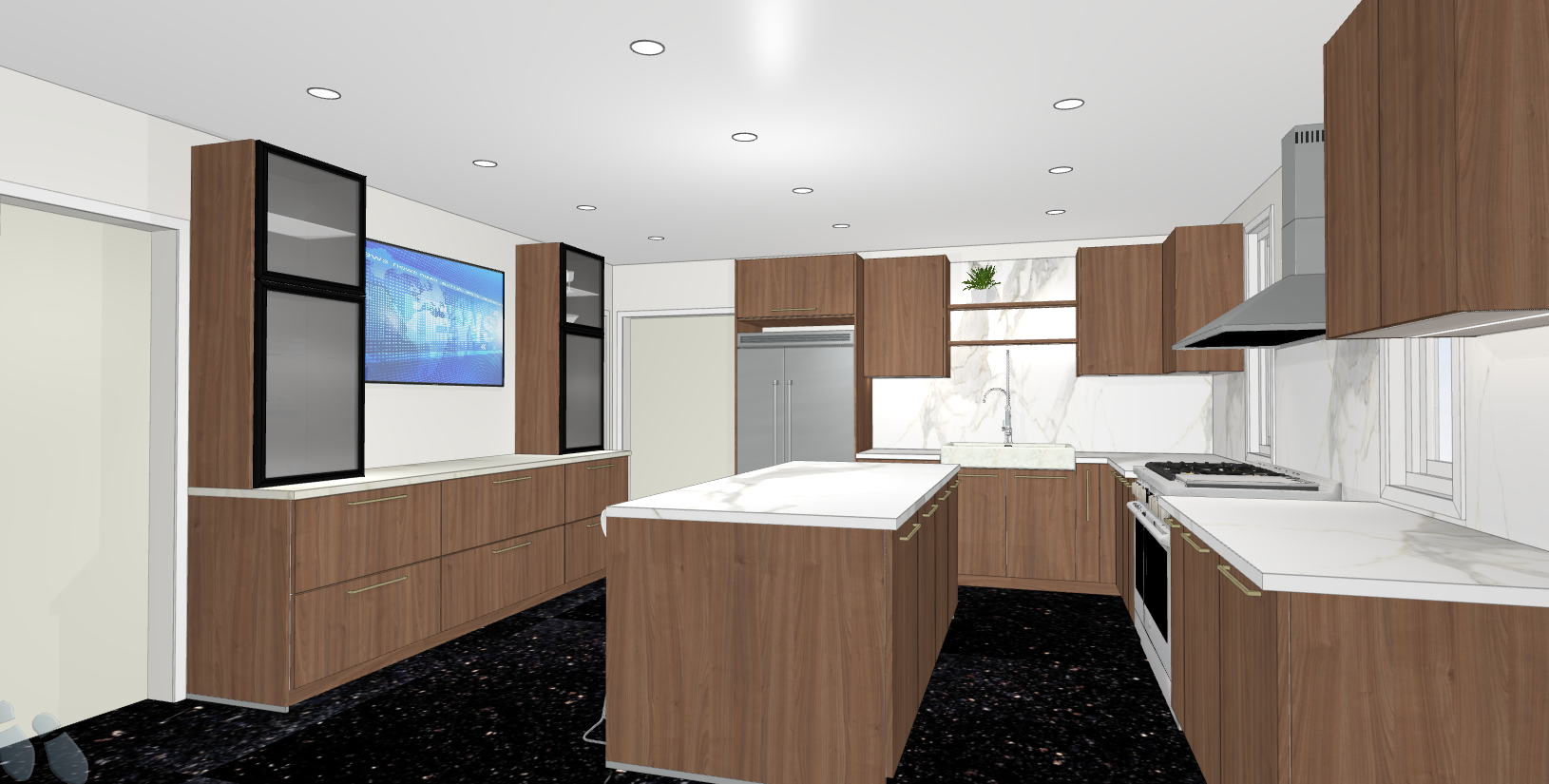 elegant kitchen with marble floor inside the glass cabinets is solid color