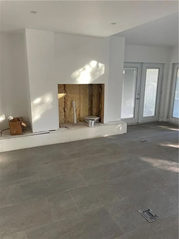 beige limestone floor modern fireplace limestone on walls add curtains beige add modern furniture in forefront
