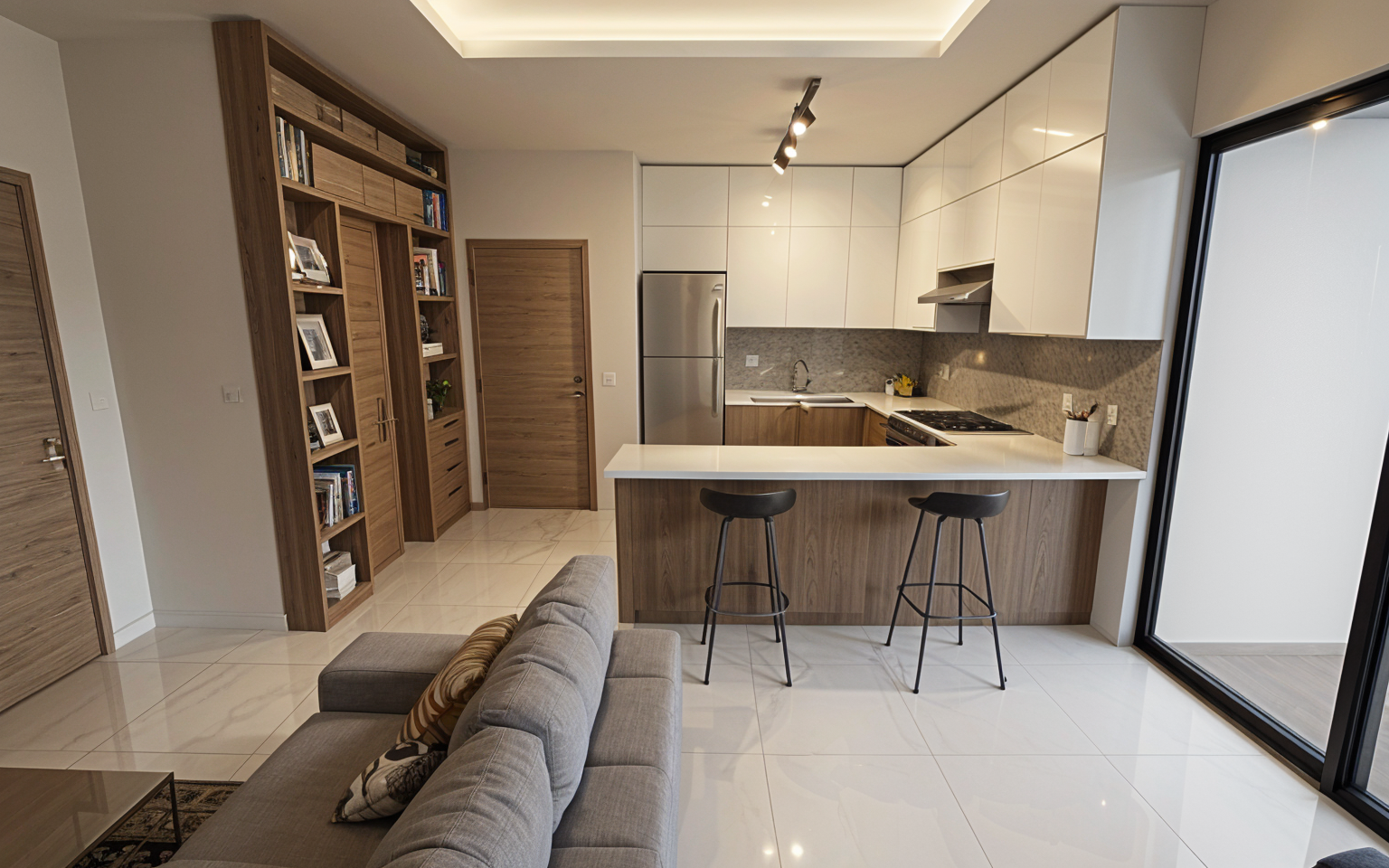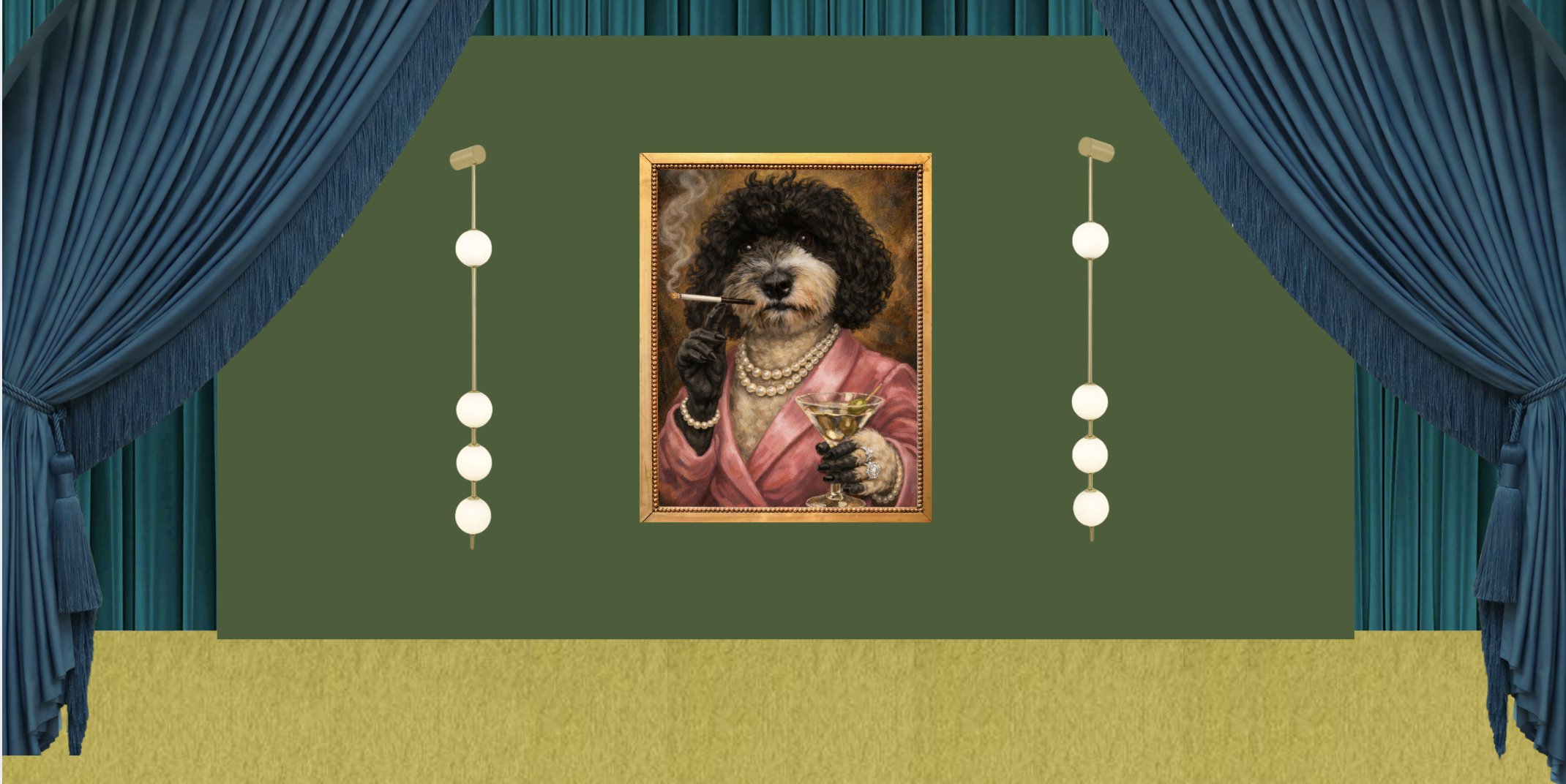 have the sconce lighting lit and the frame backlit around the frames perimeter evening time carpet is chartreuse and drape is teal