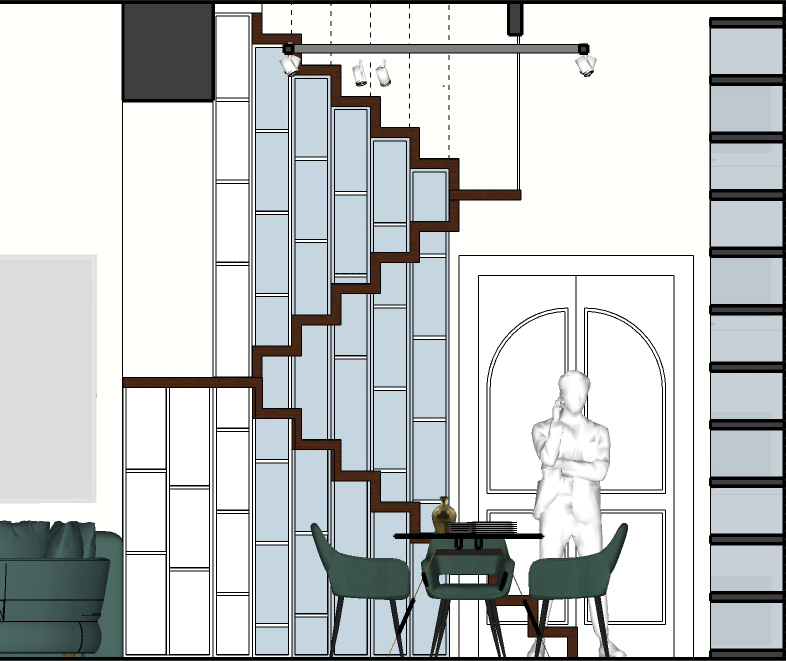 interior shot prospective view of interior with light wood bookcase whale blue walls red iron staircase