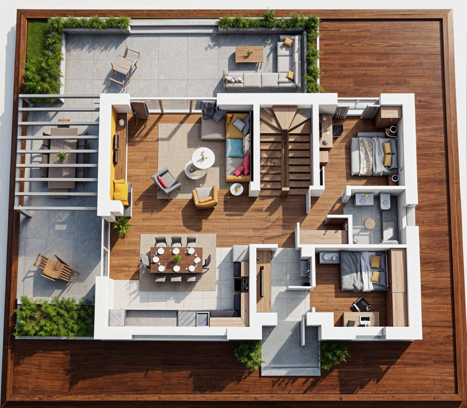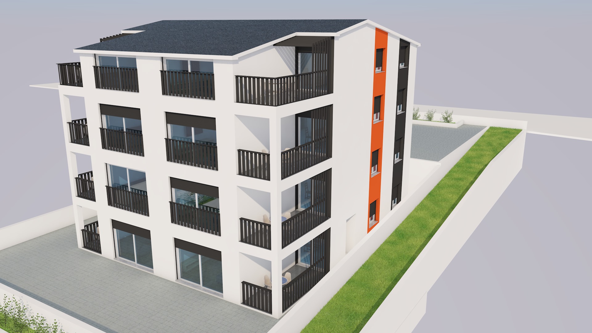 photorealistic modern mediterranean apartment building preserve original architecture preserve original colors and materials clean white plaster facade dark metal balcony railings matte black realistic glass coastal croatian karst landscape rocky terrain olive trees dry grass stone walls warm sunlight soft shadows high detail architectural visualization no material changes no color changes no redesign