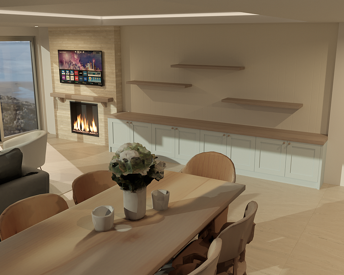 create a cozy modern living room with an elegant minimalist design the atmosphere is warm and inviting with natural light streaming through large windows walls and ceiling soft cream creating a serene backdrop fireplace stone textured earthy beige with a gently flickering warm fire tv screen displaying a vibrant cityscape with purples and blues furniture dining table and chairs light oak wood with gentle curves sofa soft gray with clean lines adding understated elegance shelving and cabinetry matte white with warm wood accents flooring light sandy beige tiles enhancing the natural look table decor a vase with green and white hydrangeas accompanied by minimalist white ceramic cups focus on balance between modern simplicity and cozy warmth