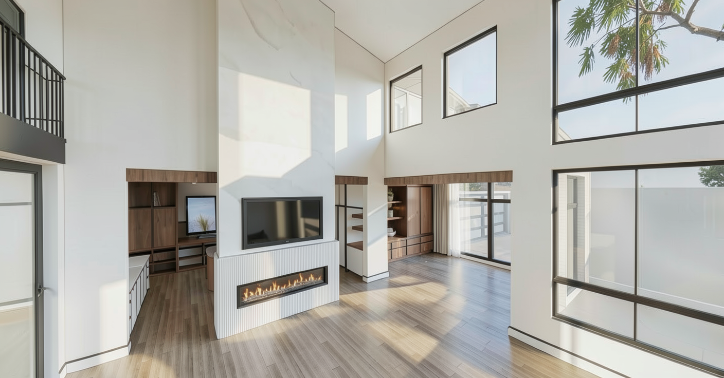 reduce the color contrast between the wall and the top edge of the baseboards lighten the top portion of the baseboards so the transition between the wall and trim is softer and more subtle while keeping the same material and finish add recessed can lights integrated into the ceiling to brighten the space use minimal flush fixtures with soft realistic illumination where the ceiling is not fully visible assume logical recessed light placement to naturally light the room preserve the existing colors materials layout and design