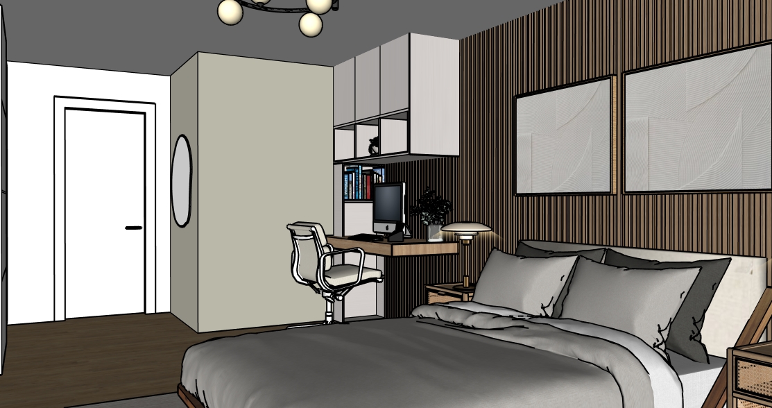 render a modern bedroom with a cozy and elegant atmosphere use a warm neutral color palette including soft green grey walls and a rich light oak wooden floor the bed features beige bedding with luxurious textured fabric the accent wall behind the bed is designed with vertical wooden slats in a light wood elegant tone the desk area is neatly organized featuring a sleek white chair and a contemporary wooden desk add ambient lighting with a glamorous chandelier and a chic modern desk lamp include abstract artwork on the walls with muted tones for a sophisticated touch light behind the desk cabinet the cabinet in off white tone a mordent and delicade celling light