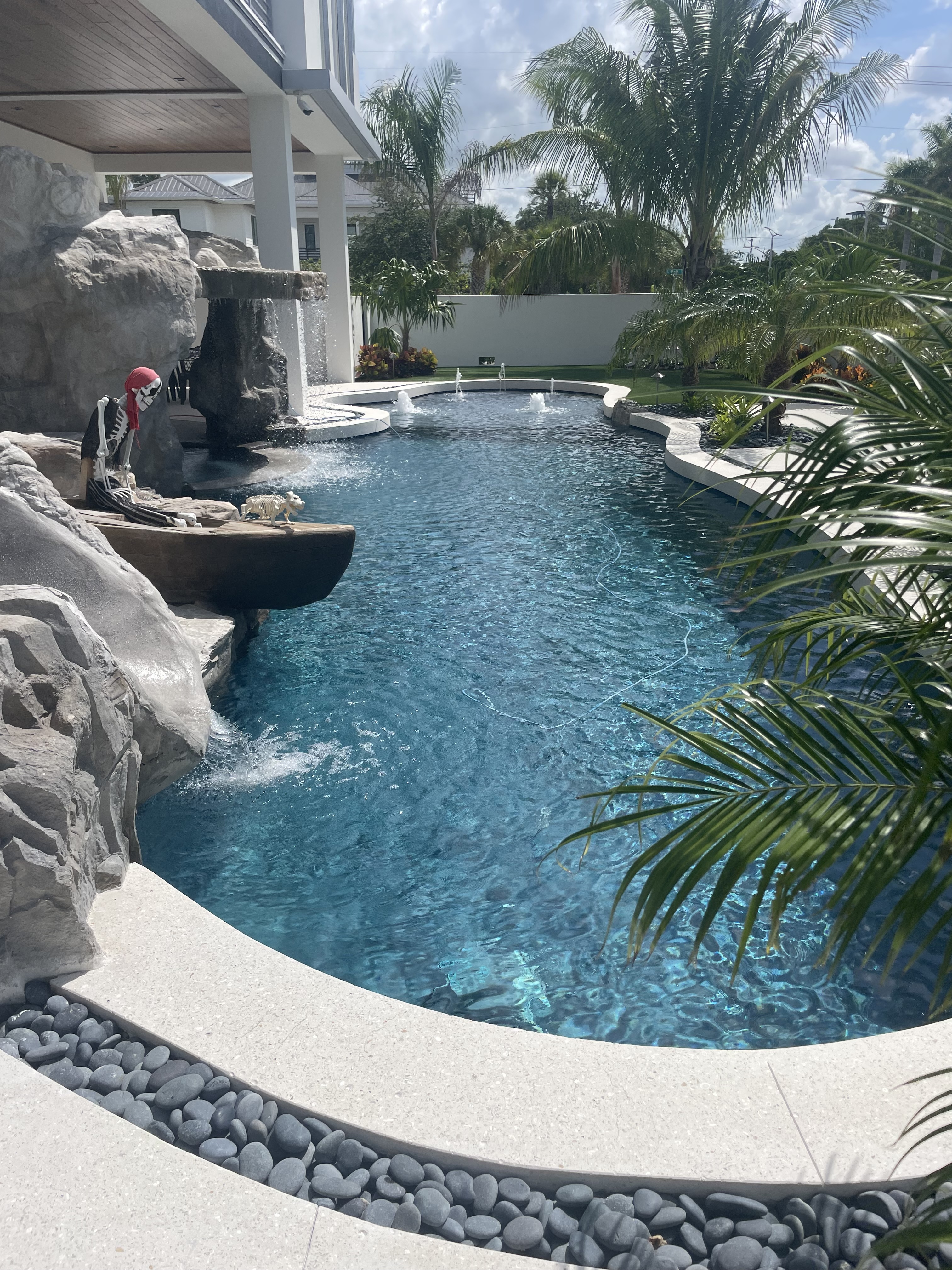 exterior shot maintain all architectural aspects of this project and render it to look photorealistic the decking will be natural ipe the planters will be wrapped in natural coral stone the roof is a bronze metal standing seam roof please use the reference photo of the pool only for the water color that we need in the pool