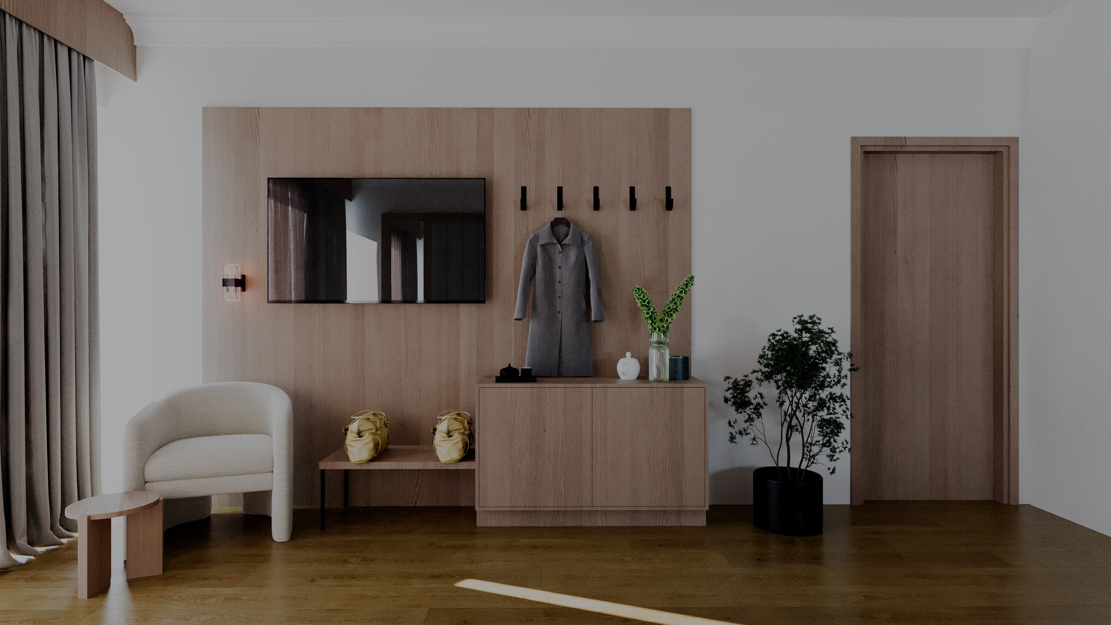 enhance this render into an ultra realistic high end interior visualization while keeping the design completely unchanged do not change the layout wall panel design tv position bench design cabinet design coat hooks chair shape side table plant position door design curtains flooring layout lighting placement proportions styling or camera angle preserve the exact composition and design exactly as shown this is another angle of the same bedroom project so it must match the other approved renders in material language realism level and lighting mood focus only on realism and refinement wood wall panel cabinet bench door and side table premium light oak veneer with elegant straight grain subtle tonal variation seamless texture mapping refined matte satin finish realistic veneer depth and clean edge detailing flooring realistic darker oak wood floor with natural plank definition subtle grain variation soft controlled reflections and consistent tone with the rest of the room upholstered chair soft premium off white fabric with realistic woven texture natural curves soft shadowing and believable fabric depth curtains realistic heavy drape fabric with proper folds thickness weight and soft interaction with daylight tv realistic black glass screen with subtle reflections proper depth and premium finish metal details realistic black hooks and other dark accents with correct roughness and soft reflections decor and plant improve realism only keeping the same objects and placement improve the lighting while keeping the same mood maintain the same warm daylight atmosphere make the sunlight and ambient interior light physically accurate improve bounce light contact shadows and ambient occlusion make the darker side of the room feel realistic not muddy or flat improve shadow transitions around furniture curtain folds under the bench under the cabinet and around the plant pot keep the image balanced elegant and natural make the render feel like a real photographed luxury hotel style bedroom interior realistic global illumination sharper material separation cleaner edge definition subtle micro texture on wood and fabric less cgi flatness natural high resolution clarity premium architectural photography look important do not redesign anything do not add objects do not remove objects do not move furniture do not change colors and do not alter the framing only improve realism and make this angle match the other renders from the same project