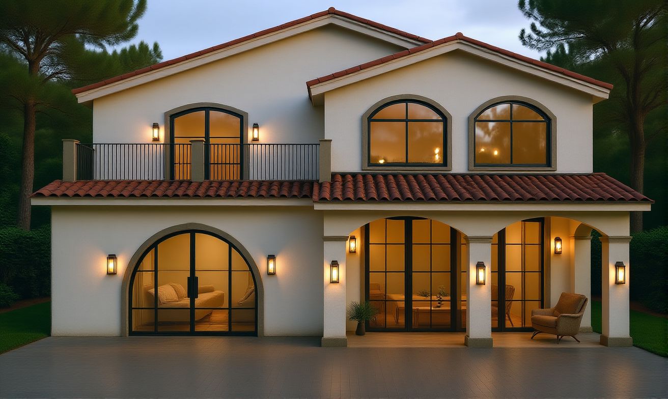 enhance the design while keeping the architecture exactly the same add modern vertical architectural wall sconces beside the windows warm recessed downlights under the roof overhang and soft interior lighting behind the windows refine the tropical landscaping with sculptural plants such as agave bromeliads and small palms while maintaining the existing planting beds photorealistic high end residential architectural visualization modern coastal design style