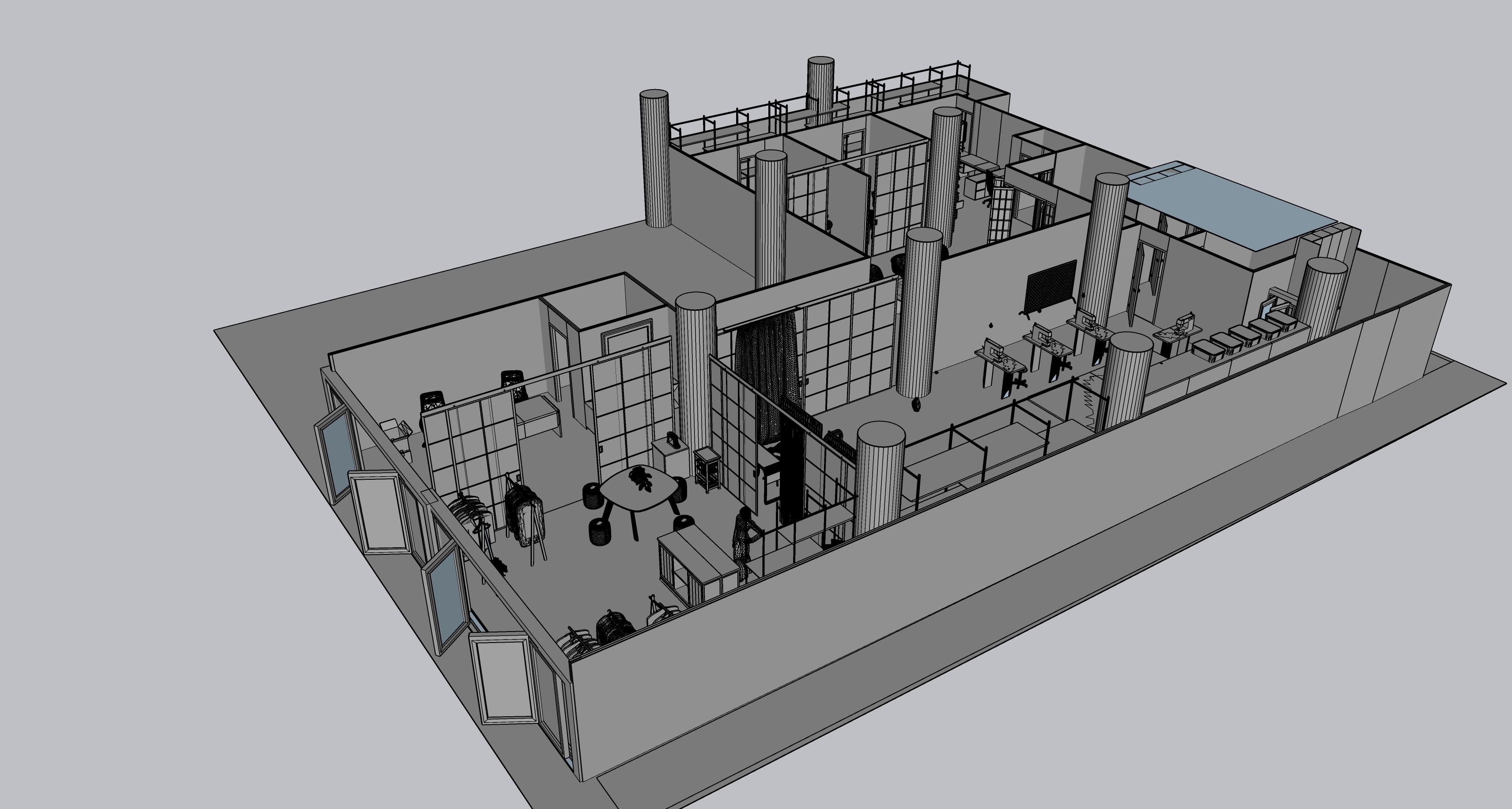 industrial offices and seamstress workshop upper interior view grey floor cocrete columns concrete walls black iron framed glass doors gren window frames on facade