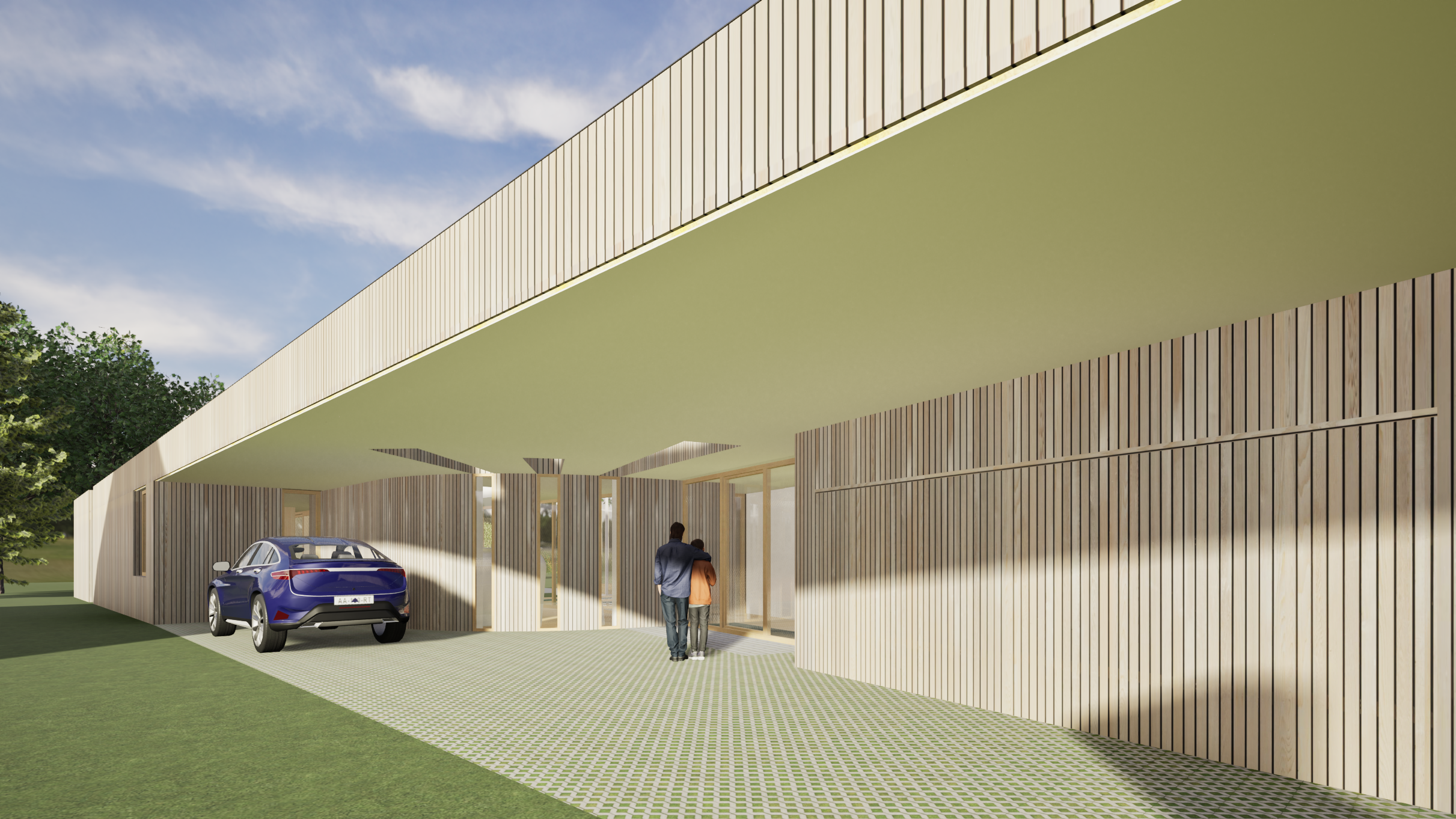 work as if you were a professional in creating 3d renderings for architectural projects without changing anything in the elements present in the original image make the visual of the new construction more realistic finally adjust the grain and lighting of the image to make it more cinematic add grass on the lawn areas change the brick pattern so it is not so repetitive leave the wood siding rendering as is keep the sky with some clouds the ground is paved with grass slabs with grass growing between the concrete
