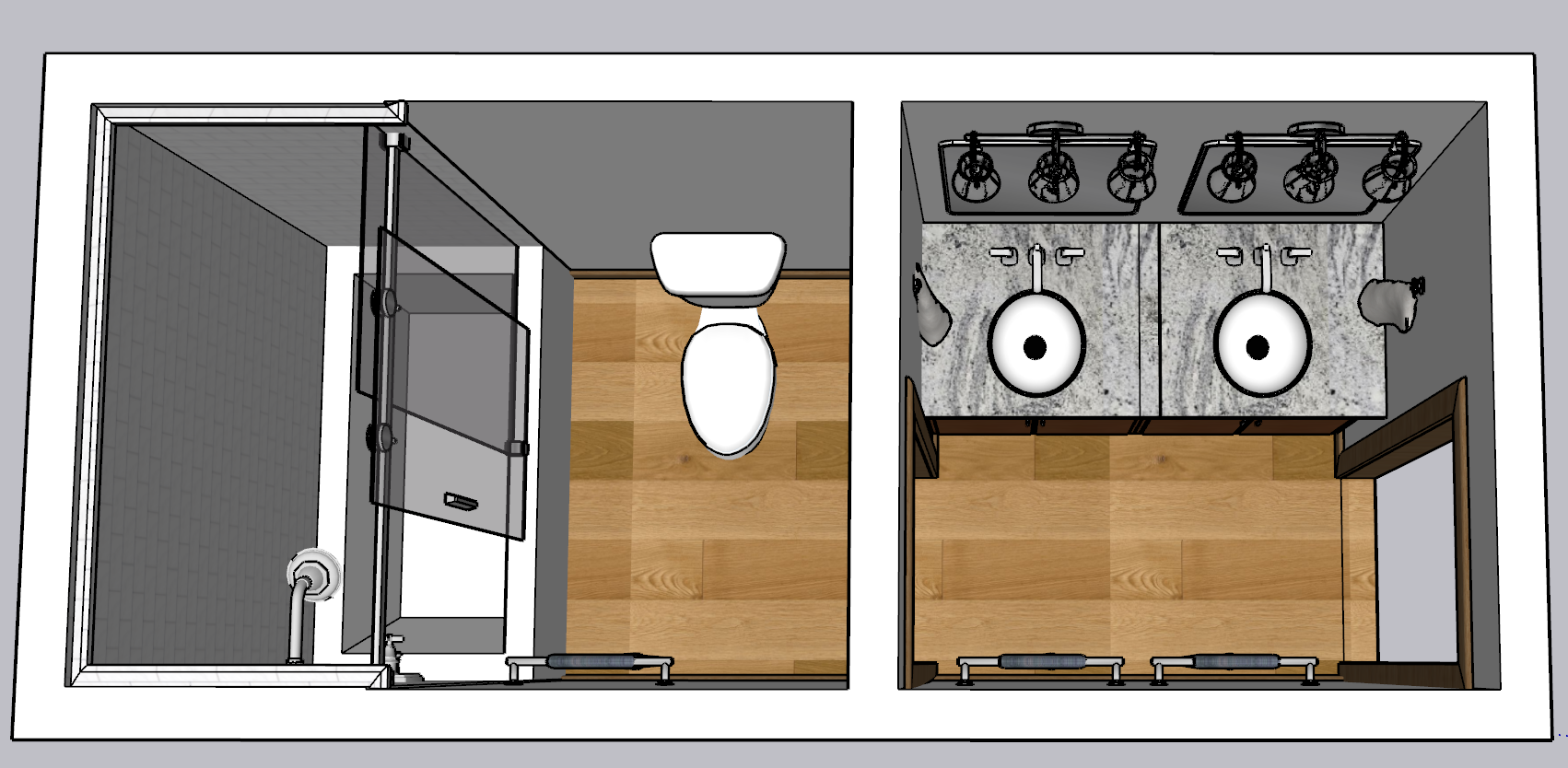 shower walls are white subway tile with white grout there is a niche in the right wall the walls are chantilly lace white add a 4 backsplash to the vanity on the back and sides make the sinks rectangles all of the hardware is brushed nickel the baseboards and doors are stained wood the floor is a orange brown rustic grain luxury vinyl plank the shower head and fixture is on the bottom wall remove the towel bar above the toilet add a glass shower door