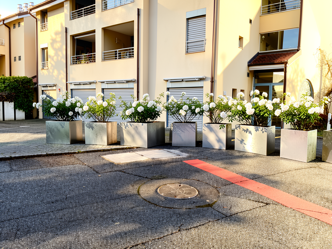 settlement street only some birds on sky cloudy shiny day green garden mowed some flowers black roof tiles circle planted in front with car driving near by circle in the middle of the house