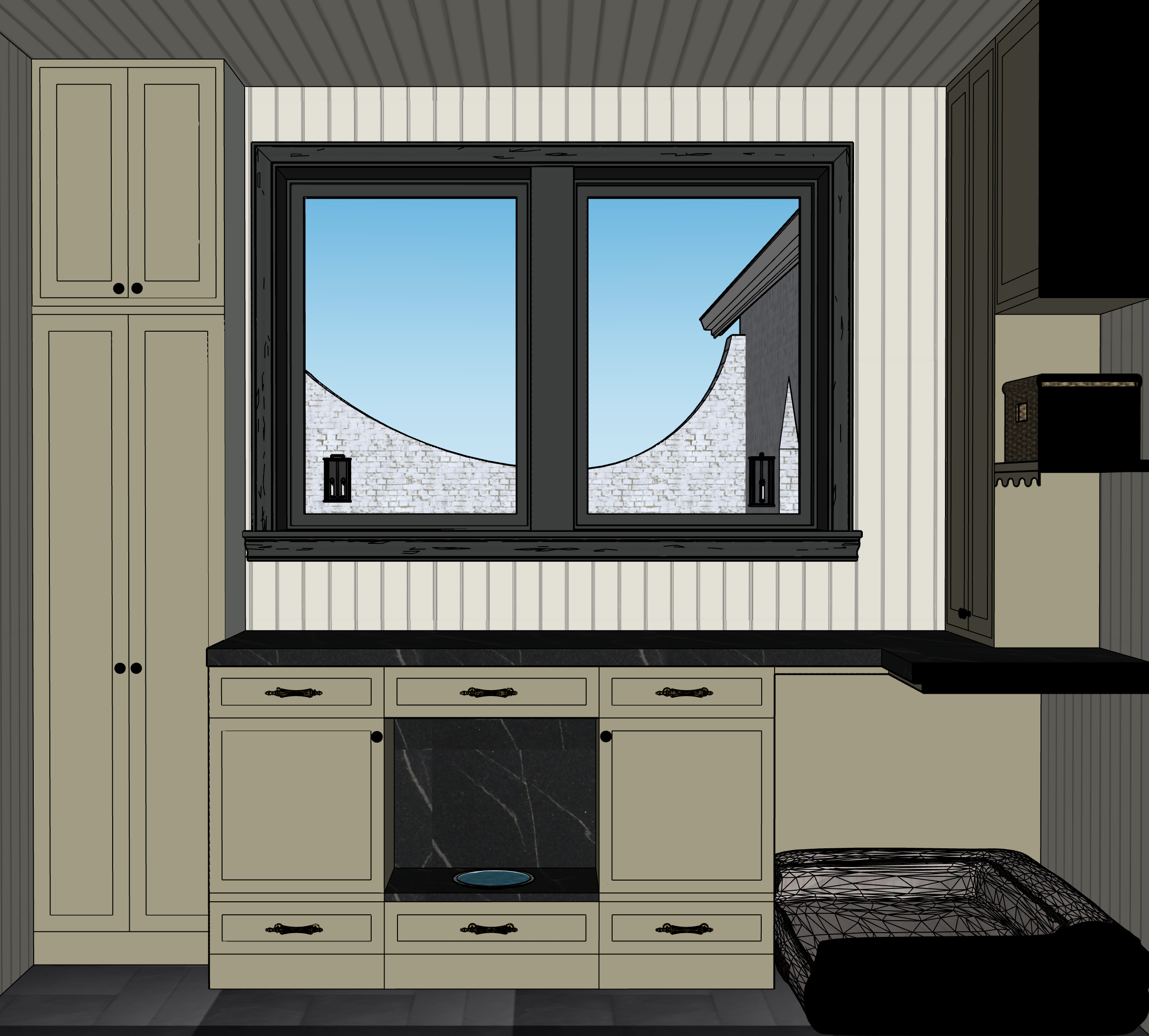 accurate colors and textures good lighting this mudroom has a small water bowl in the middle under the cabinet dog beds are under the cabinets to the right for a black lab window has black window trim no sink