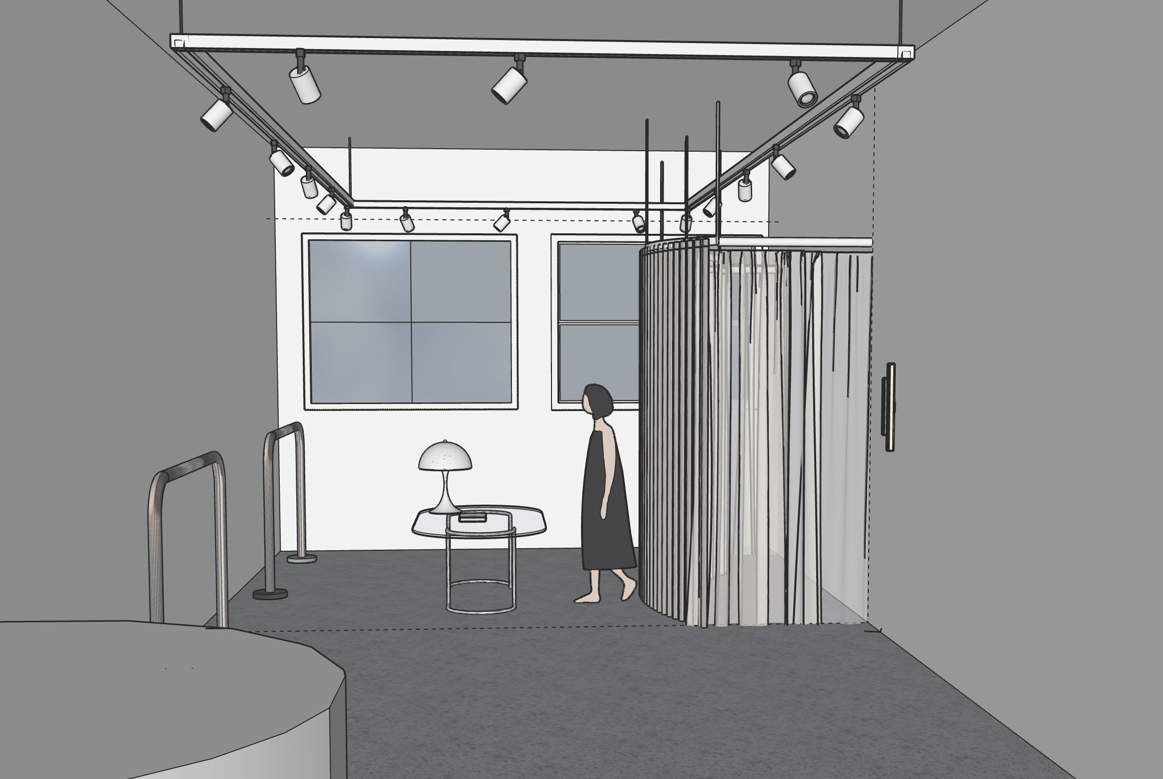 floor is concrete spot rails in ceiling is white the door is a mirror