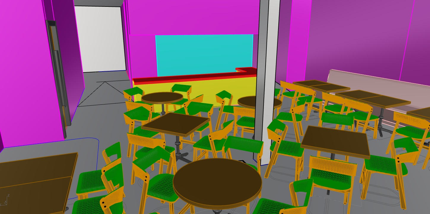 create a 3d render image of the space from the same angle maintain the shapes of the furniture and space in the image pink areas in the image are banquet seatings with make them green fluted velvet fabric upholstery and base of banquet is dark oak green areas in the image are terracotta coloured velvet upholstery of the chairs orange areas in the image that is chair wood is light oak material brown colours in the image are calacatta table tops table legs are black matte metal floor is light oak parquet magenta colors are warm terracotta clay plaster with a soft matte texture red area in the picture is rosso levanto marble counter top front of the bar counter is horizontal cut travertine stone with uneven surface there are metal black painted 4x4 cm profile hanginf shelves over the bar counter decorate them with green plants and some turkish style china