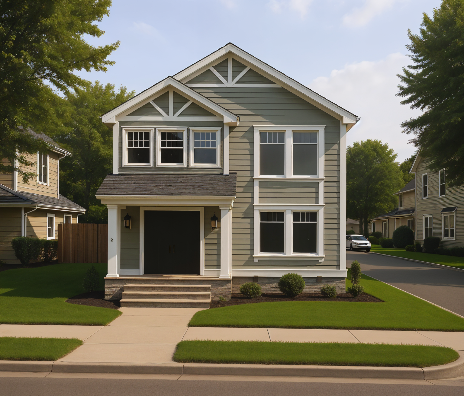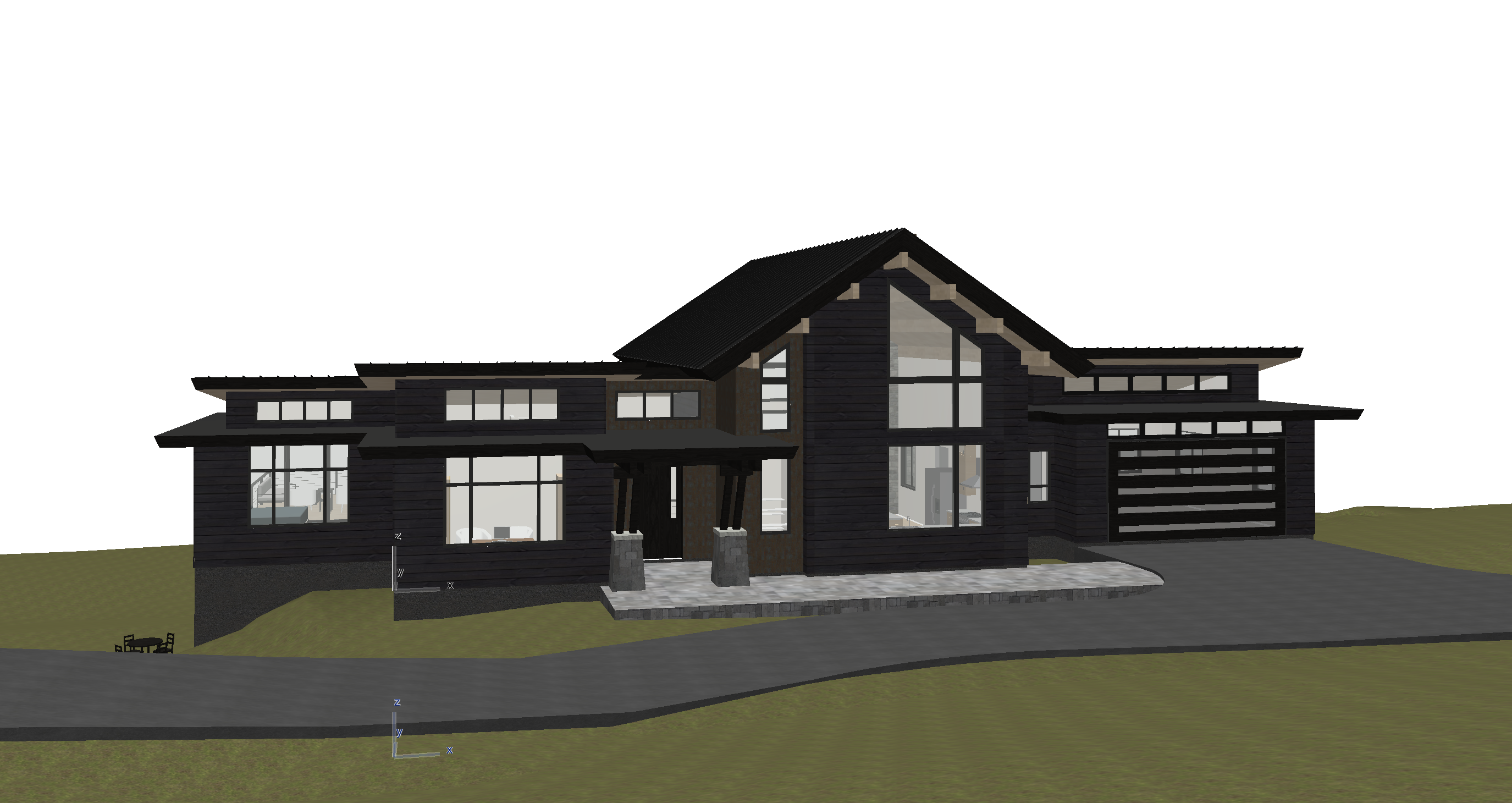 grainy watercolor render of modern home with black and medium tone wood siding surrounded by woods with formal landscaping around the house and driveway architecture