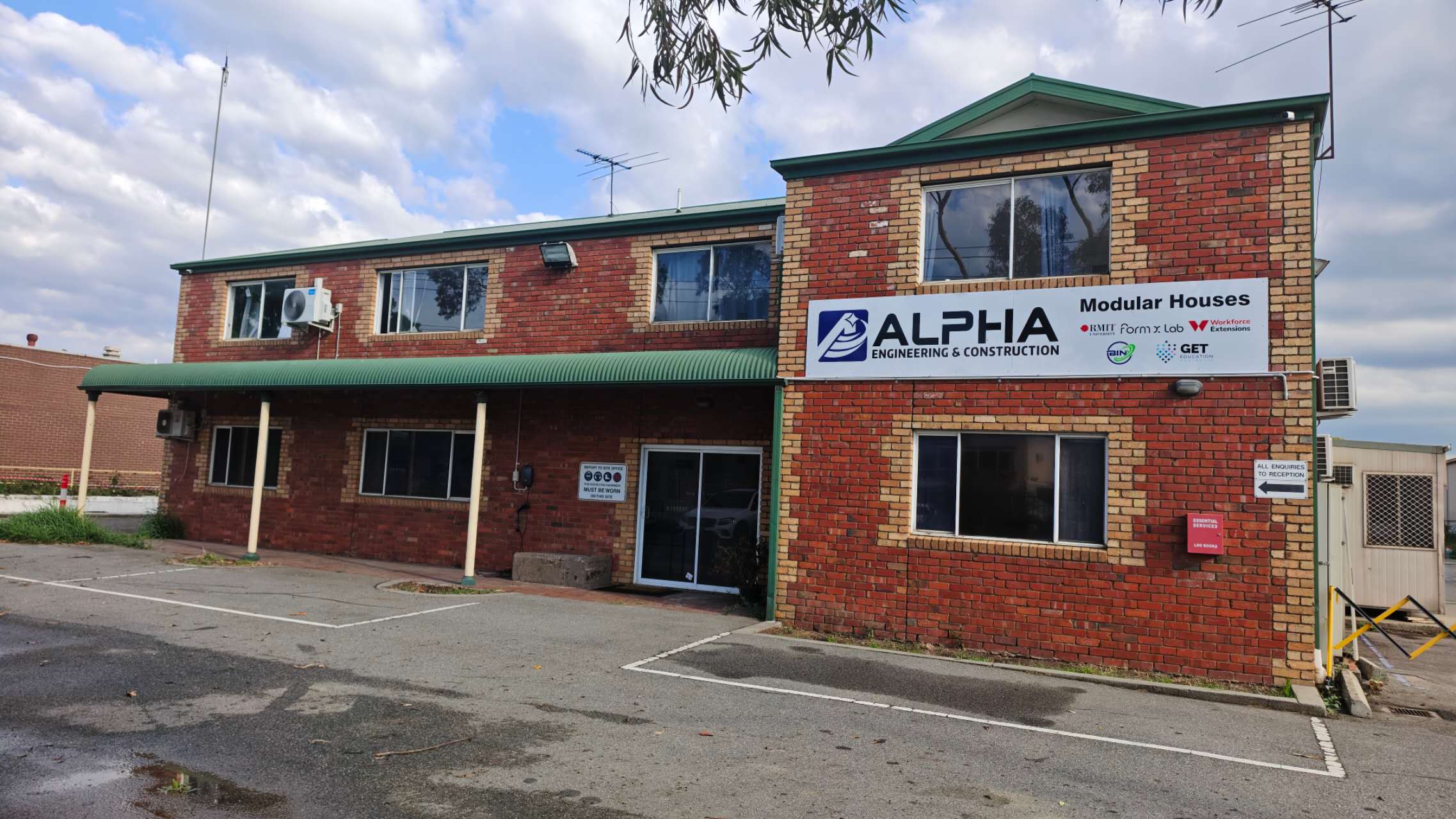a two storey white brick factory front facade