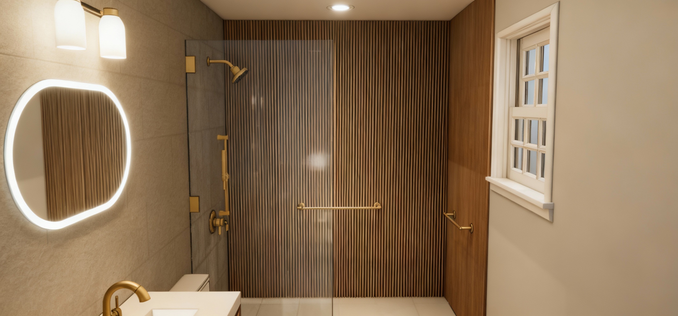 mirror with white glass edge light scones have no shine vanity light scones are matte white glass turn vanity light on at 3000k showerhead does not have lighting on it right shower wall has thin 3d wood slat like tiles the ceiling has recessed lights also turned on at 3000k these ceiling recessed lights are not shown but we need to see the light source