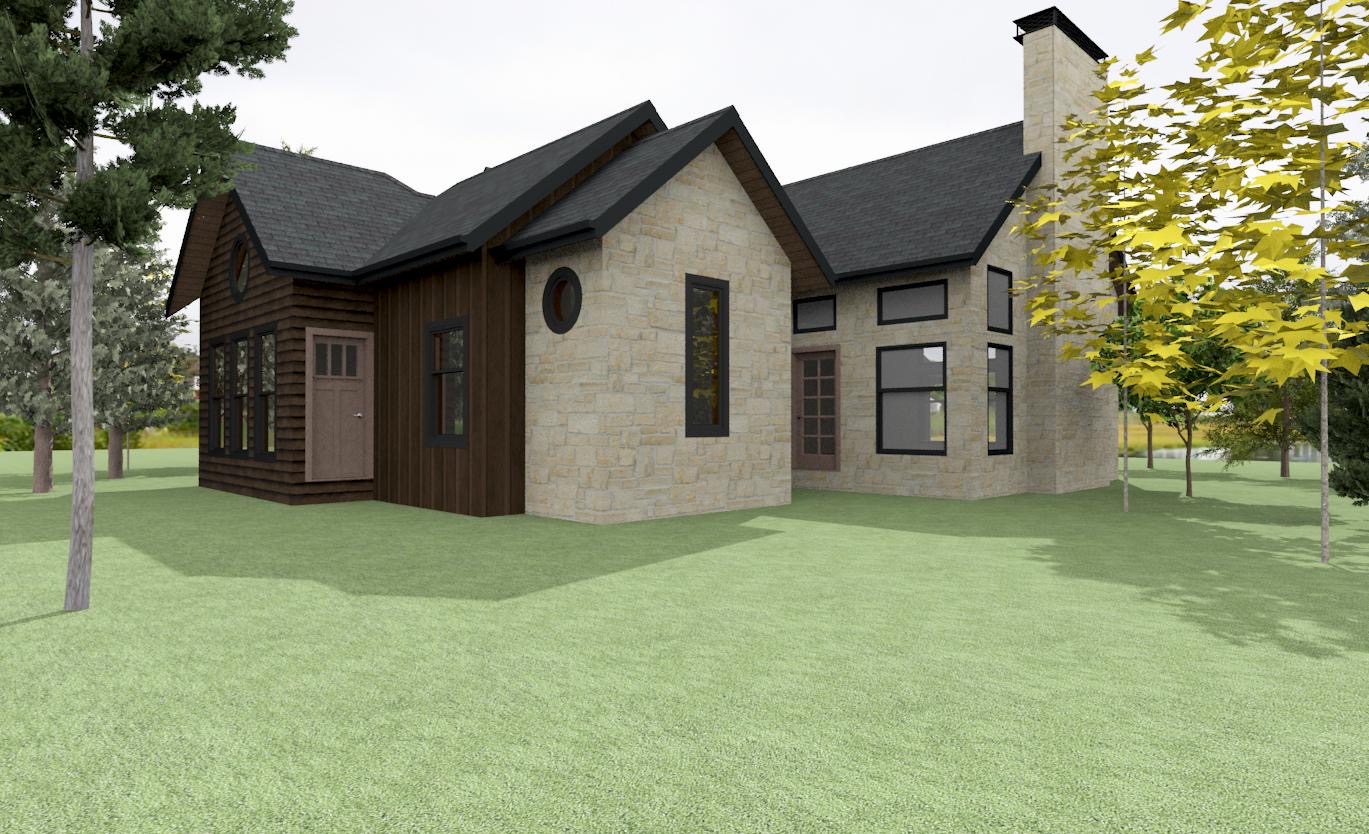 make this photorealistic do not change any of the design details add landscaping with walk ways to each door with a patio