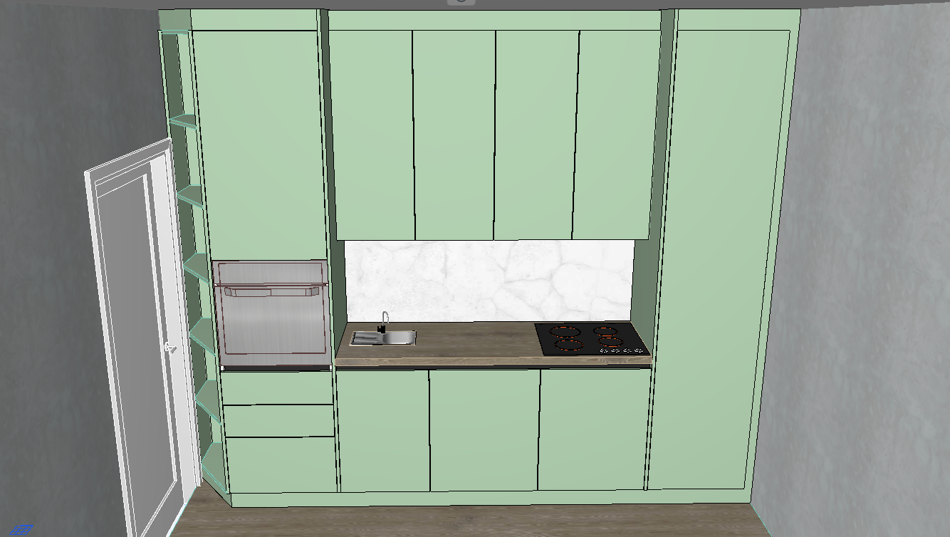 photorealistic render of an existing archicad kitchen model strictly preserve original geometry layout proportions and all elements exactly as they are do not redesign do not add do not remove do not change positions kitchen cabinets in matte olive green color accurate olive tone flat mdf surfaces keep all panel divisions exactly as modeled countertop horizontal surface in light natural wood texture with realistic grain front vertical panel of countertop white marble with subtle grey veins clearly distinct from the wood top keep appliances exactly as they are built in oven black ceramic cooktop small sink and faucet only improve material realism glass metal reflections lighting only soft natural daylight coming from the left side door area no artificial lighting no led no extra light sources materials realistic pbr textures correct roughness and reflections very subtle imperfections only no exaggeration walls and floor keep exactly same colors and materials just make them realistic light grey walls natural wood floor camera same view and angle as original eye level no cinematic effects no depth of field rendering style ultra realistic global illumination soft shadows ambient occlusion important no stylization no redesign no extra objects no decoration no changes in structure